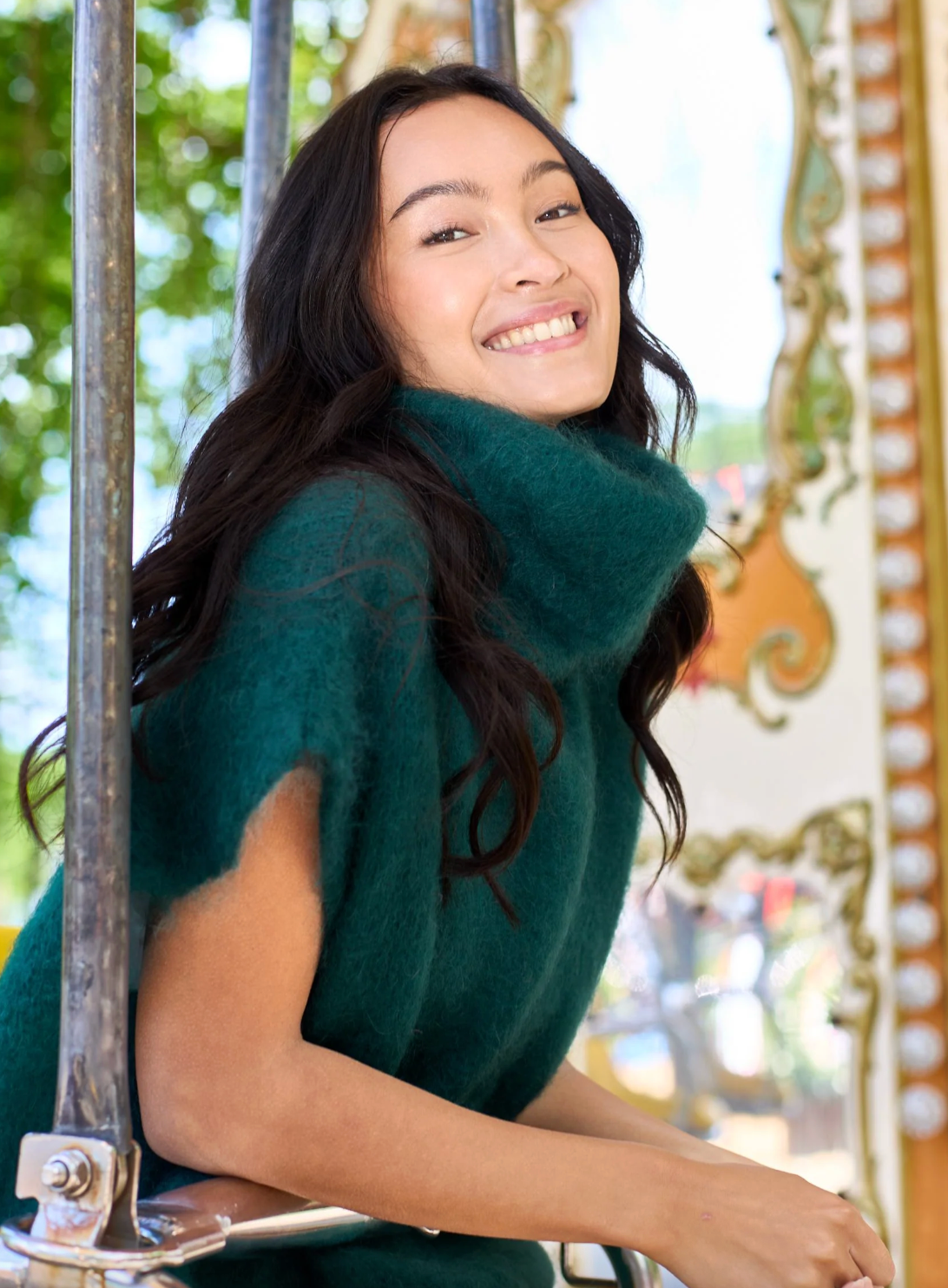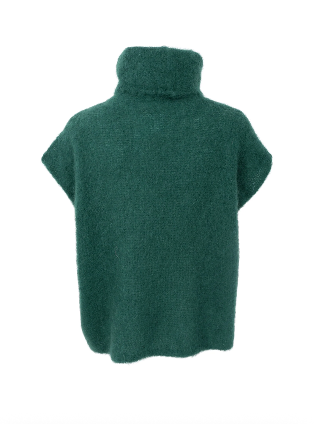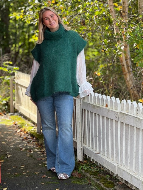 En myk og lun strikkevest med høy rullekrage og korte ermer. Den har en løs og avslappet passform som gjør den perfekt til lag-på-lag styling – bruk den over en skjorte, en tynn strikkegenser eller en langermet topp for et moderne og gjennomført uttrykk.