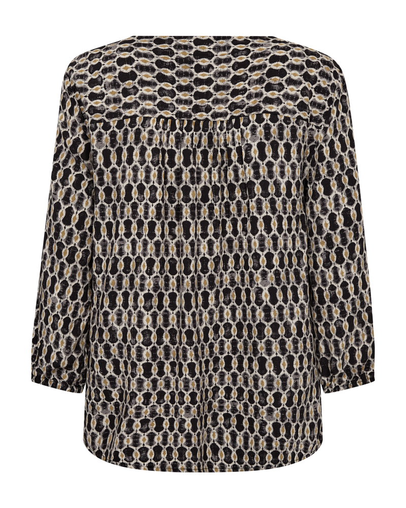 Blusen har en sort bunnfarge med diskré mønster i Moonbeam (offwhite) som gir et moderne og stilrent uttrykk. Den har en løs og ledig passform, som gjør den både komfortabel og flatterende – perfekt til deg som liker klær som sitter pent uten å stramme.