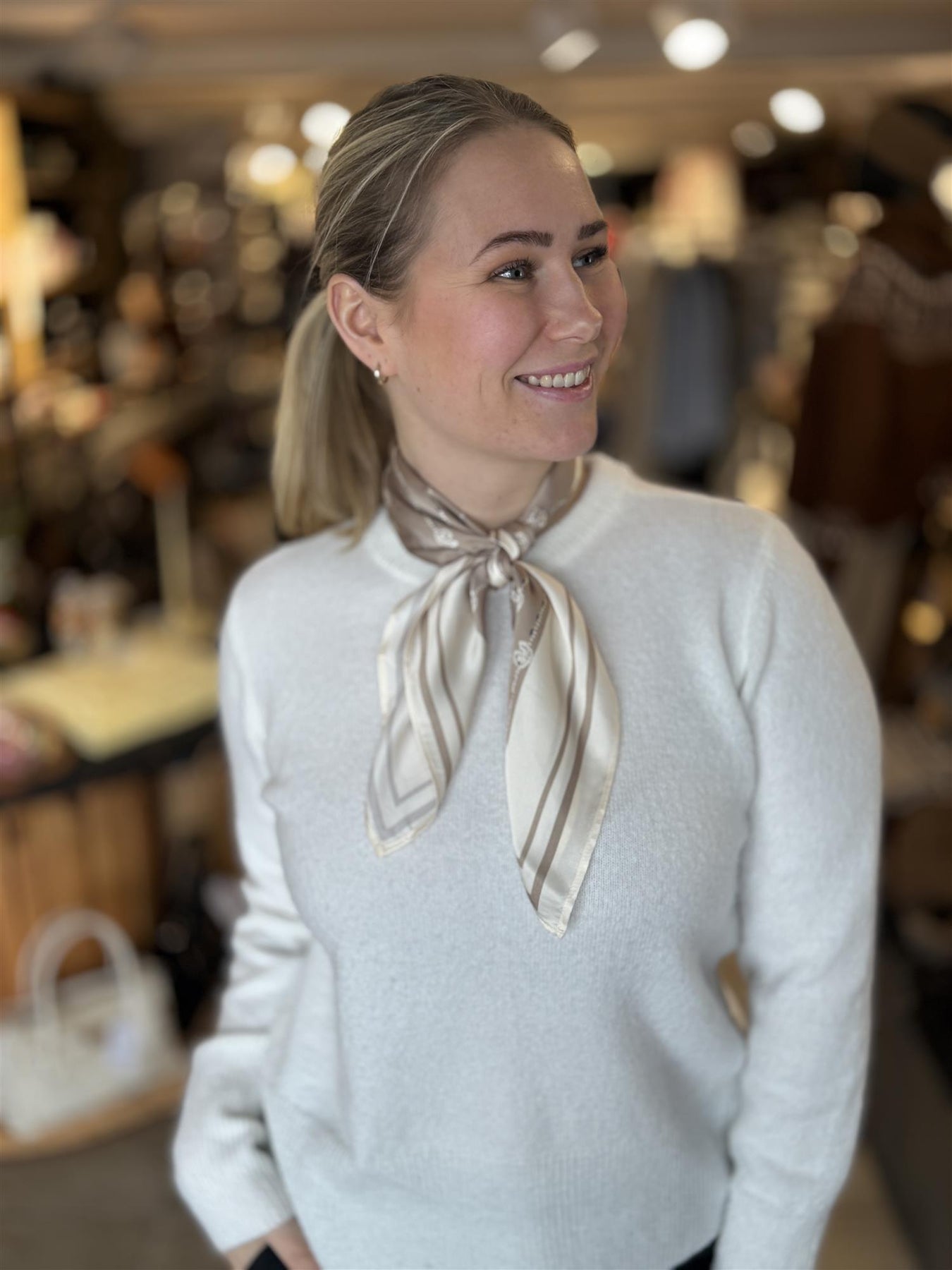 Dette fine bandana/skjerfet er et skikkelig humørboost til garderoben 🤎 Med sitt fine mønster og beige farger gir det antrekket det lille ekstra – enten du bruker det rundt halsen, i håret, på veska eller knyter det i livet slik bildene viser.