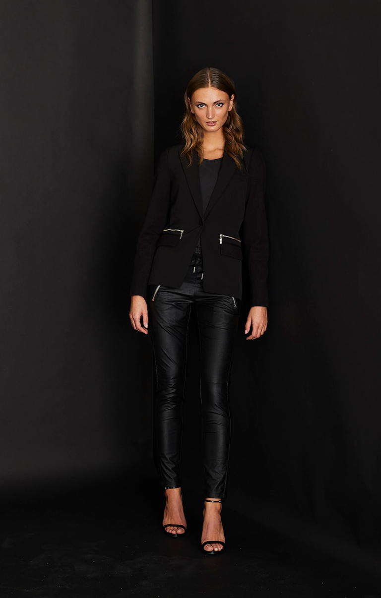 Sort coated bukse med strikk i livet og råstilige glidelåsdetaljer i sølv fra Rue De Femme.