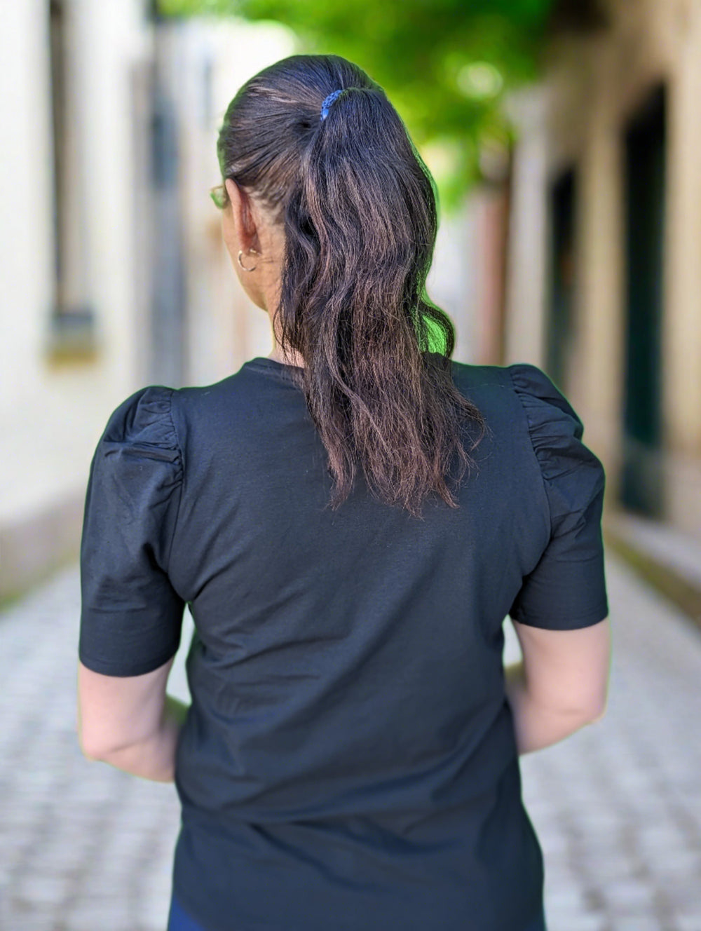 T-skjorte i mykt stoff. T-skjorten er enkel i designet med normal passform, avrundet hals med ribbestrikk samt korte puffermer. En feminin og elegant T-skjorte i nydelig kvalitet.