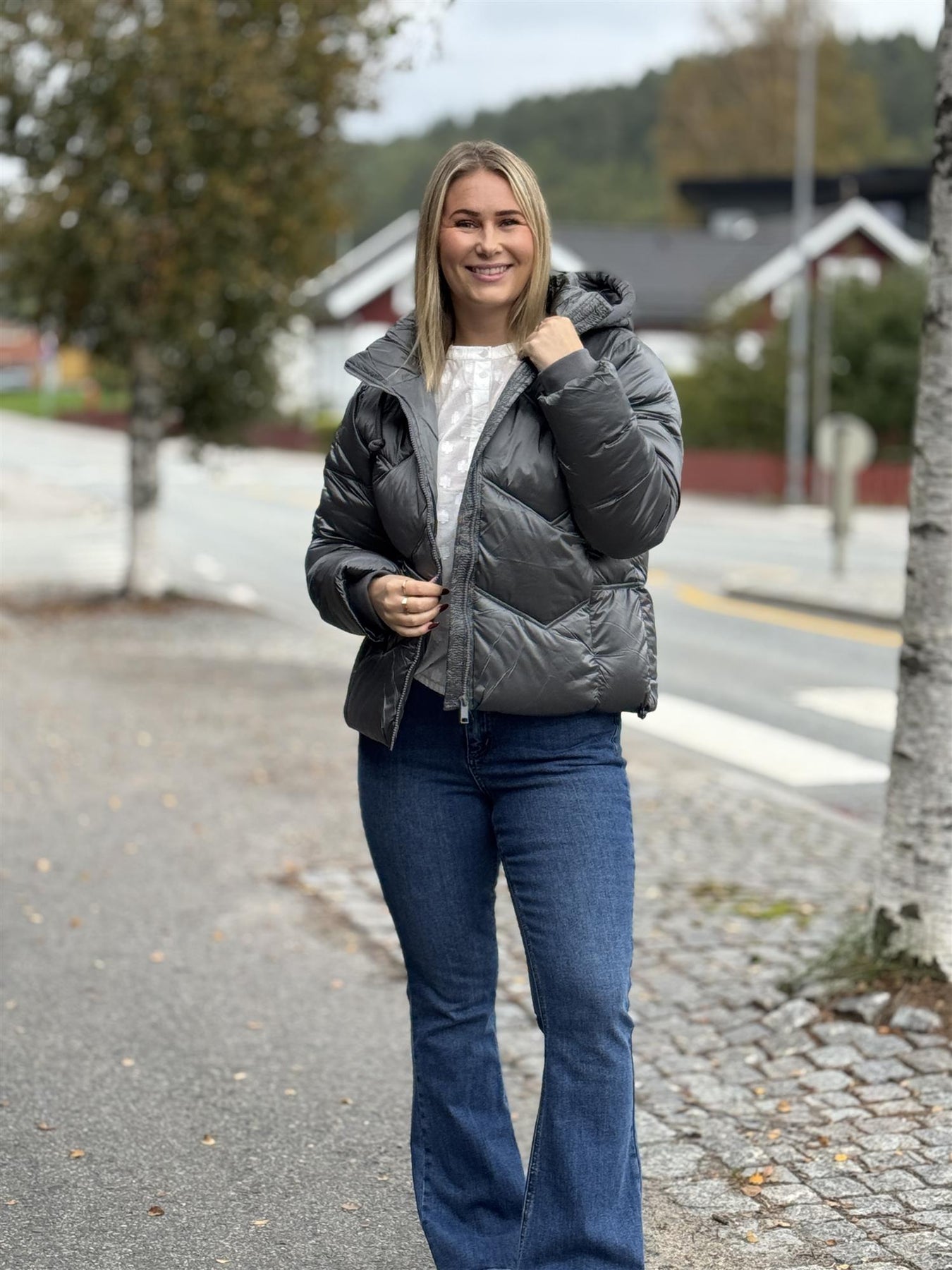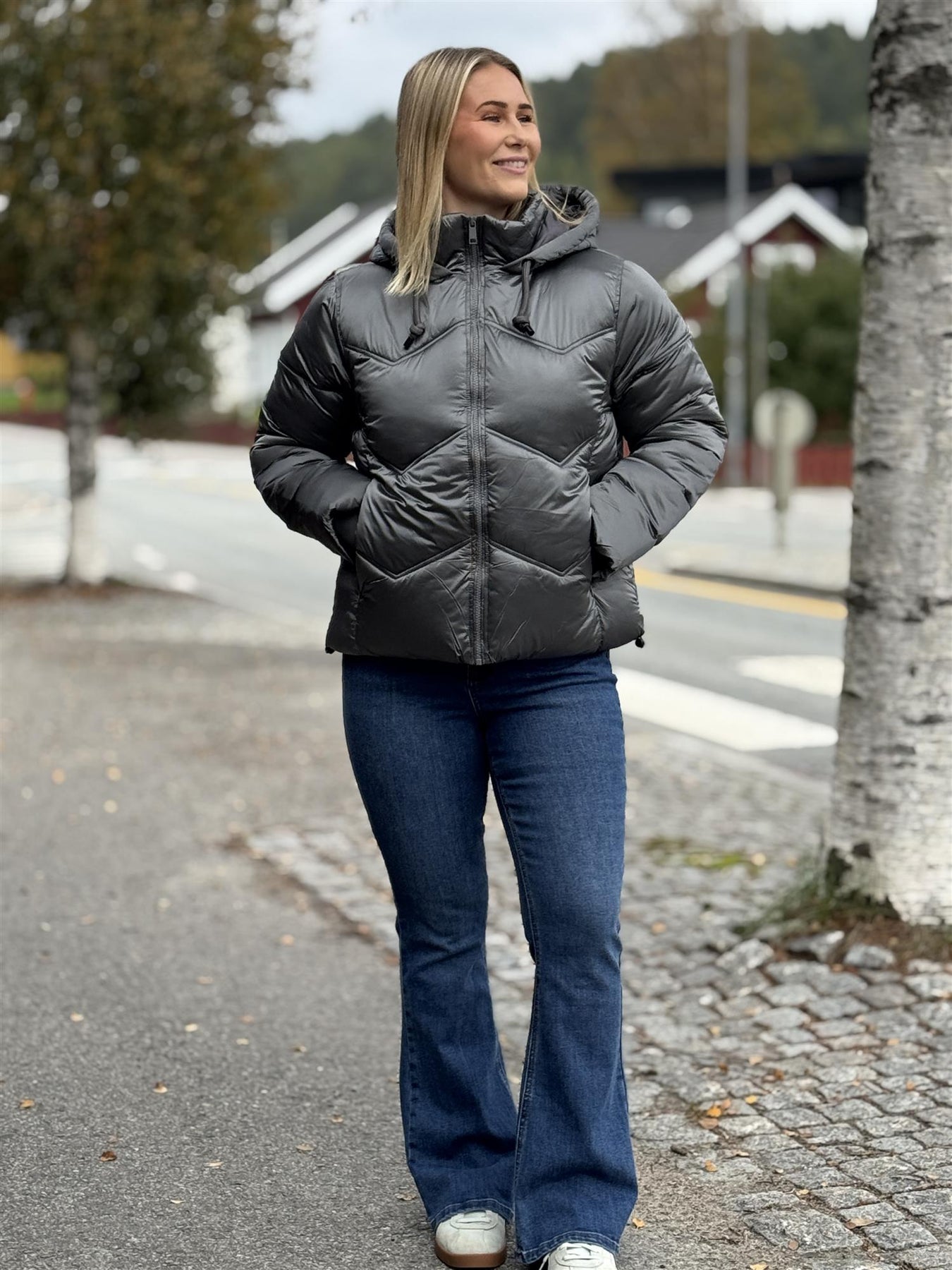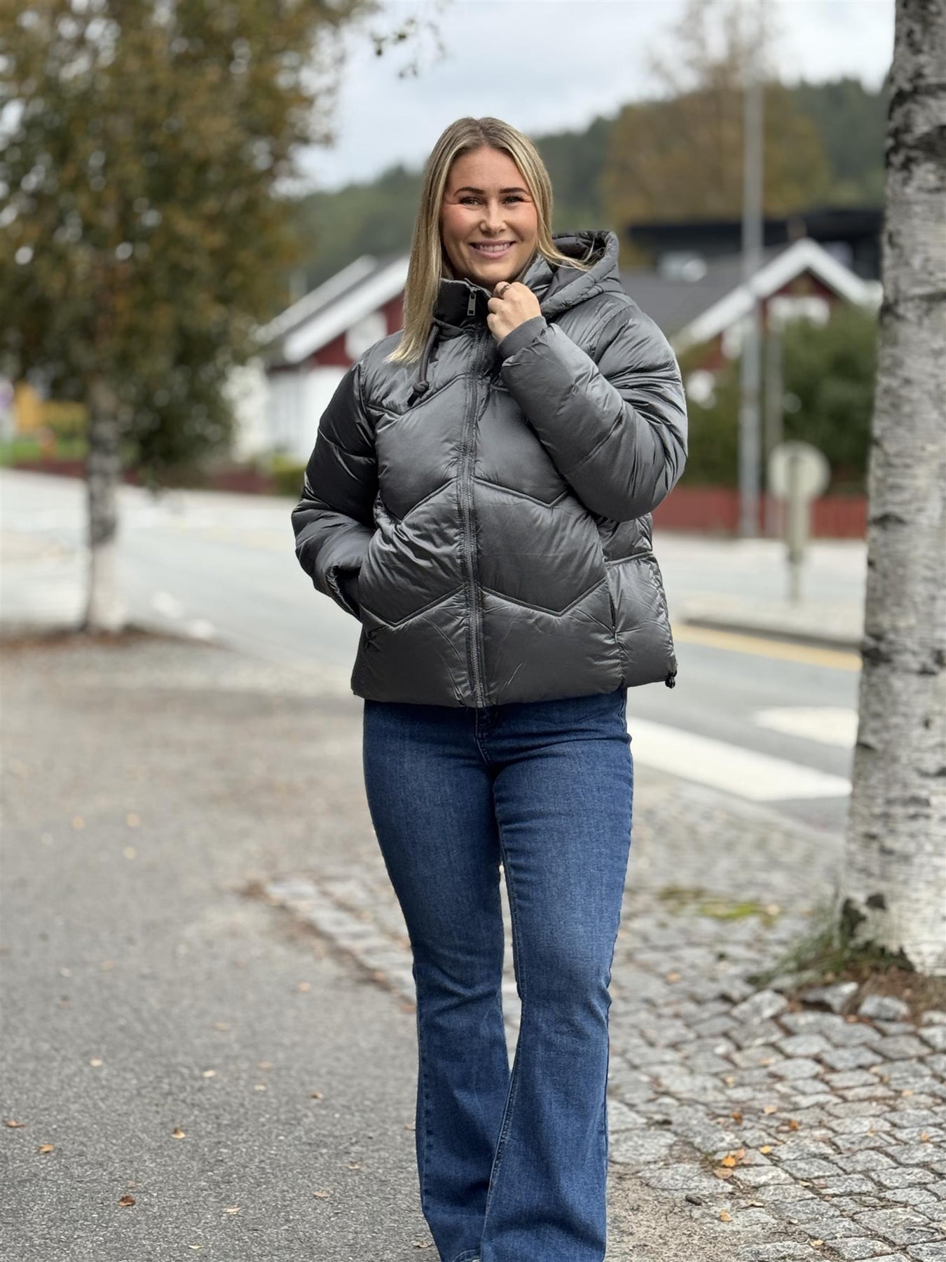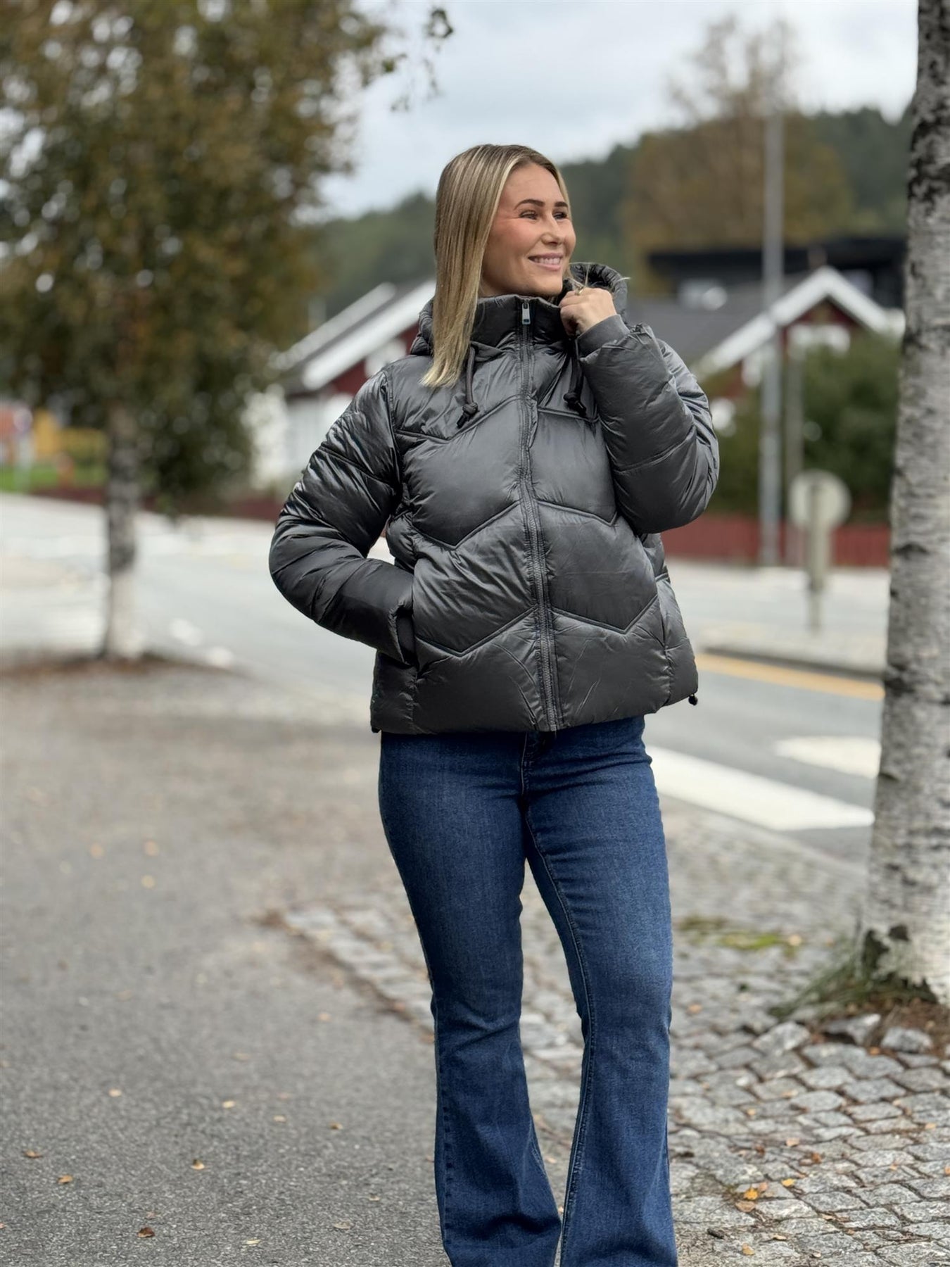 Tøff sølvfarget vattert ytterjakke fra Freequent. Jakken er kort i modellen har glidelåslukking, lange ermer med ribbekanter, sidelommer, hette med snøring og løs passform.