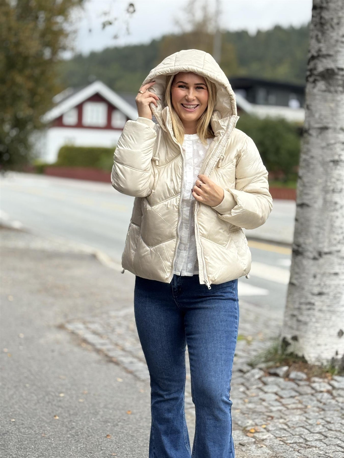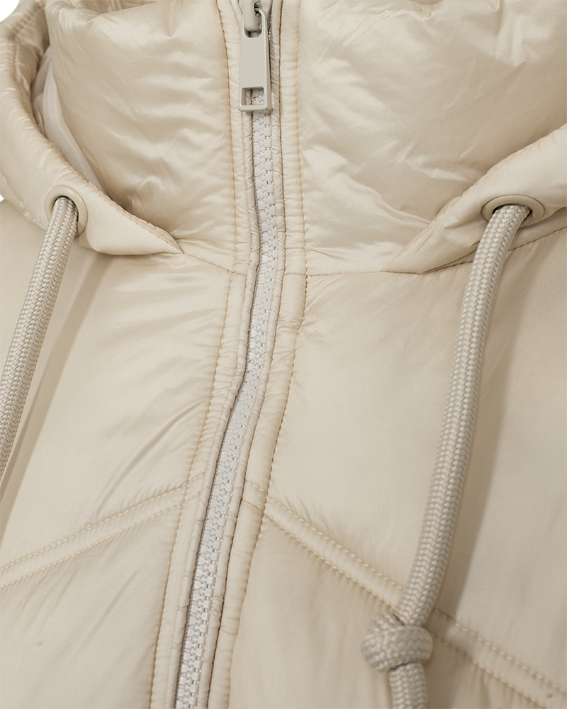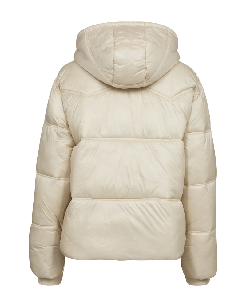 Tøff vattert ytterjakke fra Freequent. Jakken er kort i modellen har glidelåslukking, lange ermer med ribbekanter, sidelommer, hette med snøring og løs passform.