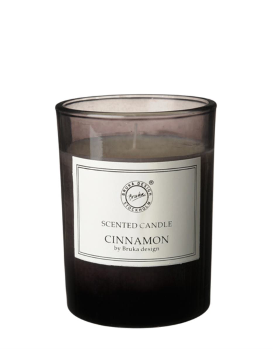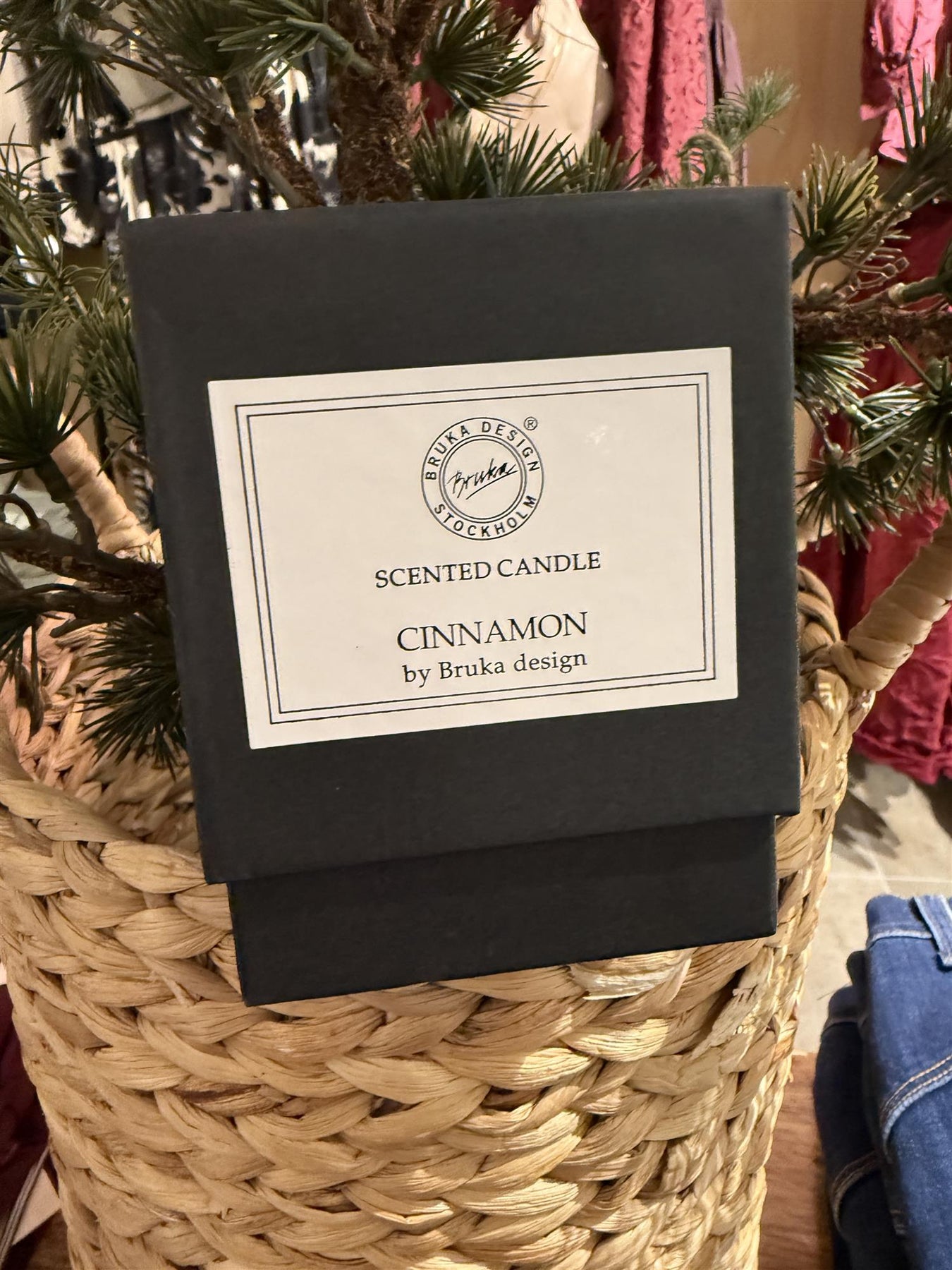 Selve lyset er hvitt i sotet glass med teksten Cinnamon. Kommer levert i Sort gaveeske