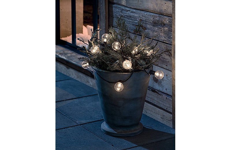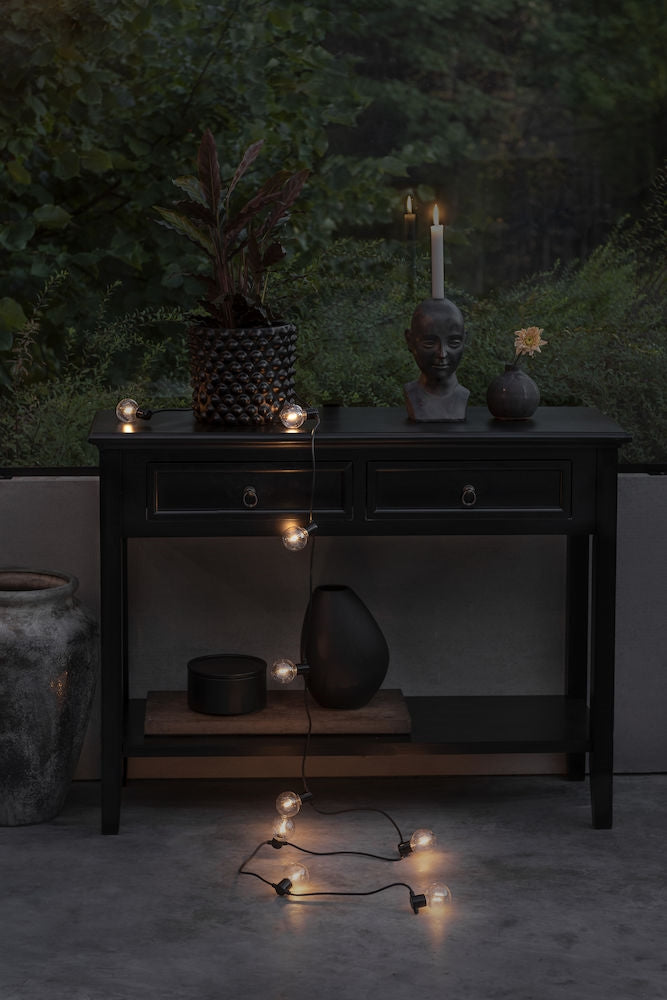 Lysslynge med 10 varmhvite LED på batteri. Sort kabel med innebygget timer. Timeren sørger for å skru slyngen av automatisk 6 timer etter den ble igangsatt.