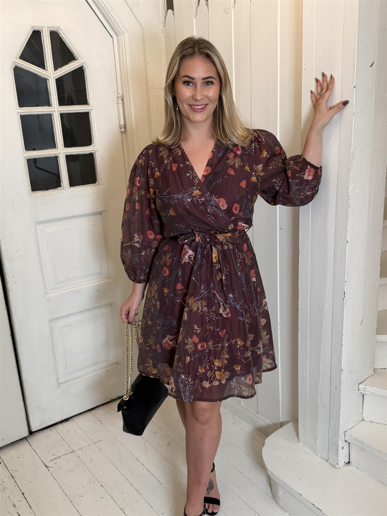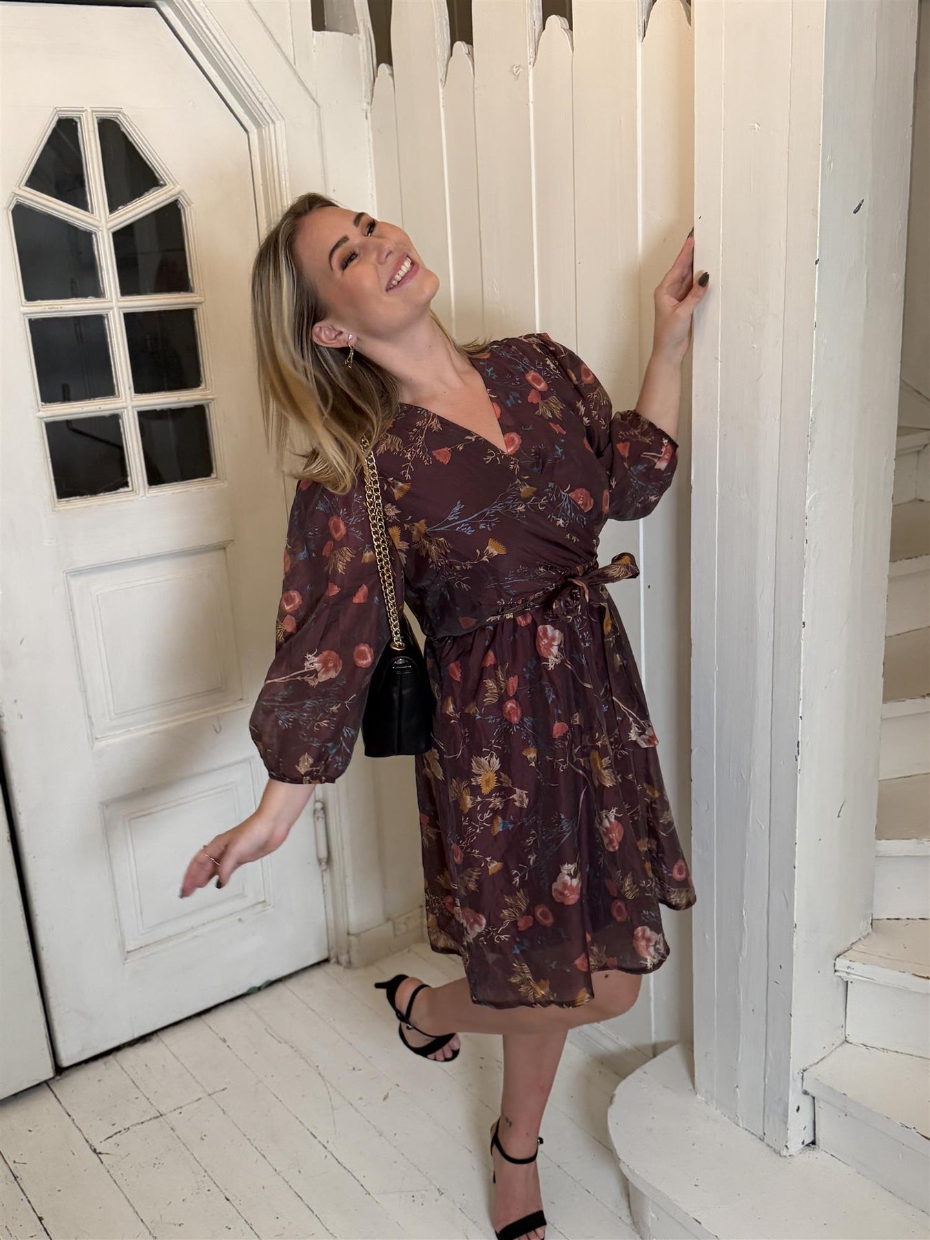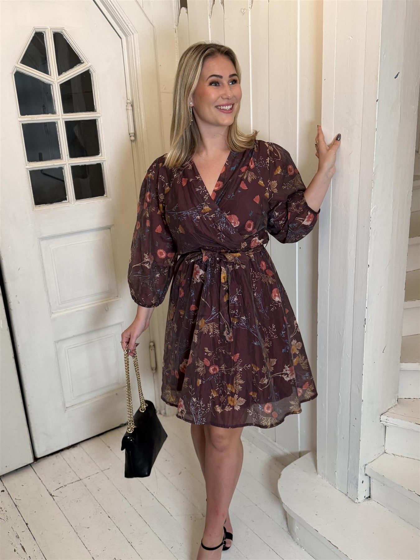 SBLeyia er en nydelig omslagskjole i 100% viskose med et lekkert blomsterprint i varme høsttoner. Kjolen har v-hals, 3/4-lange ermer med lett puff og strikk i livet som fremhever fasongen. Det avtagbare knytebeltet gir mulighet til å justere passformen, og skjørtet har en feminin vidde som faller fint. Perfekt kjole til både jobb, hverdags og festlige anledninger – like fin med boots som med strømper og pumps.