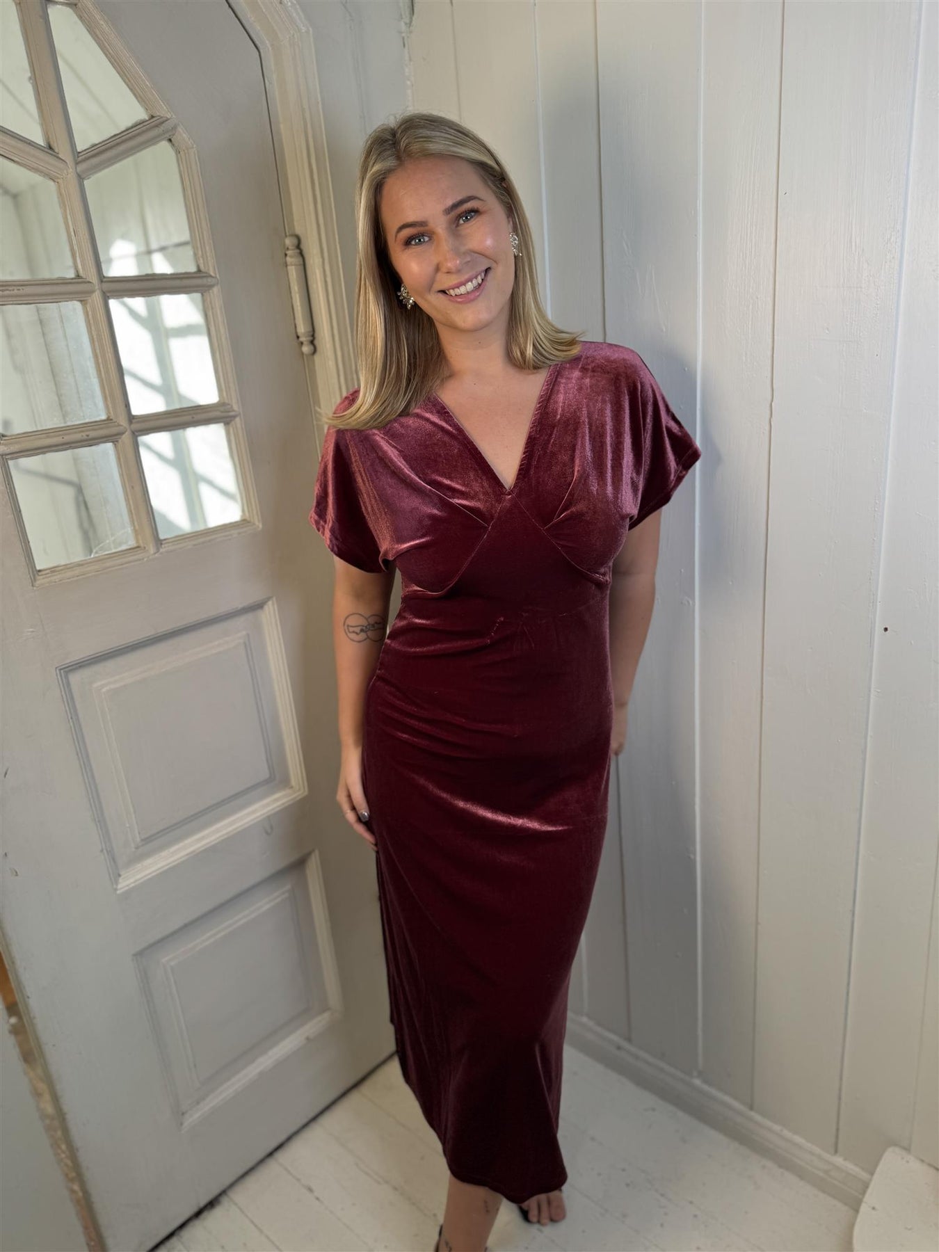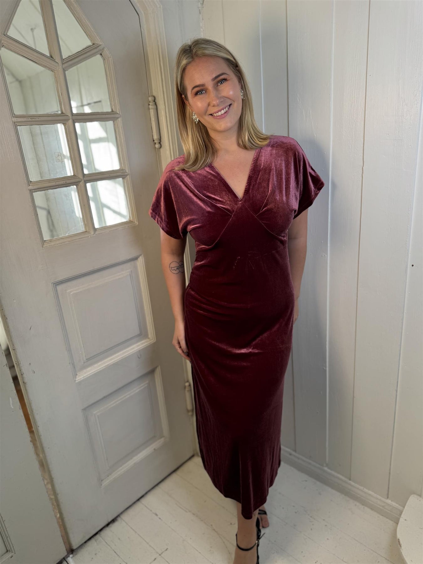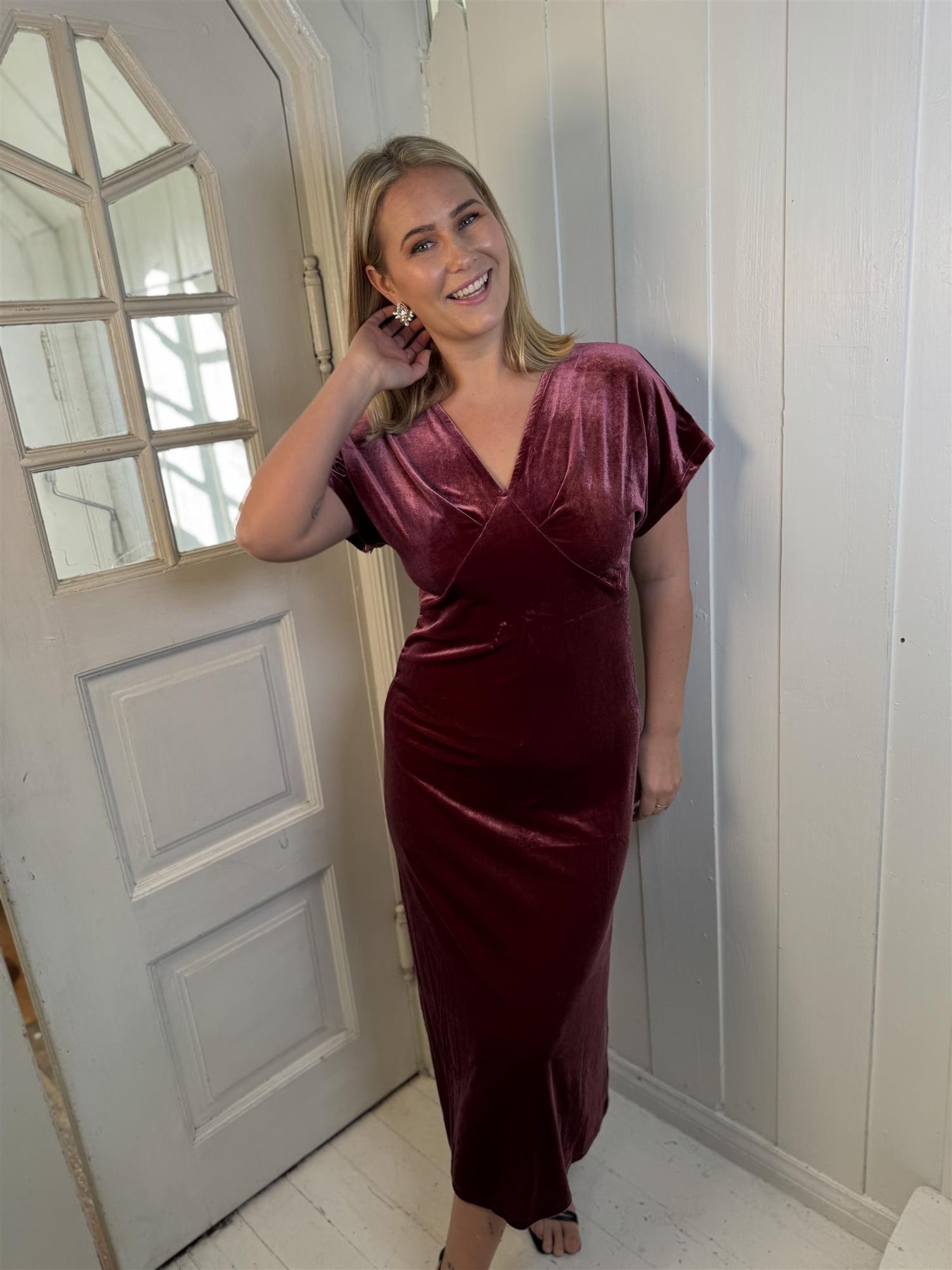 Denne kjolen i fargen Zinfandel er et blikkfang av eleganse – myk, glansfull og utrolig behagelig å ha på. Den har en klassisk midi-lengde, korte ermer og en dyp V-hals som gir en flatterende og feminin silhuett.