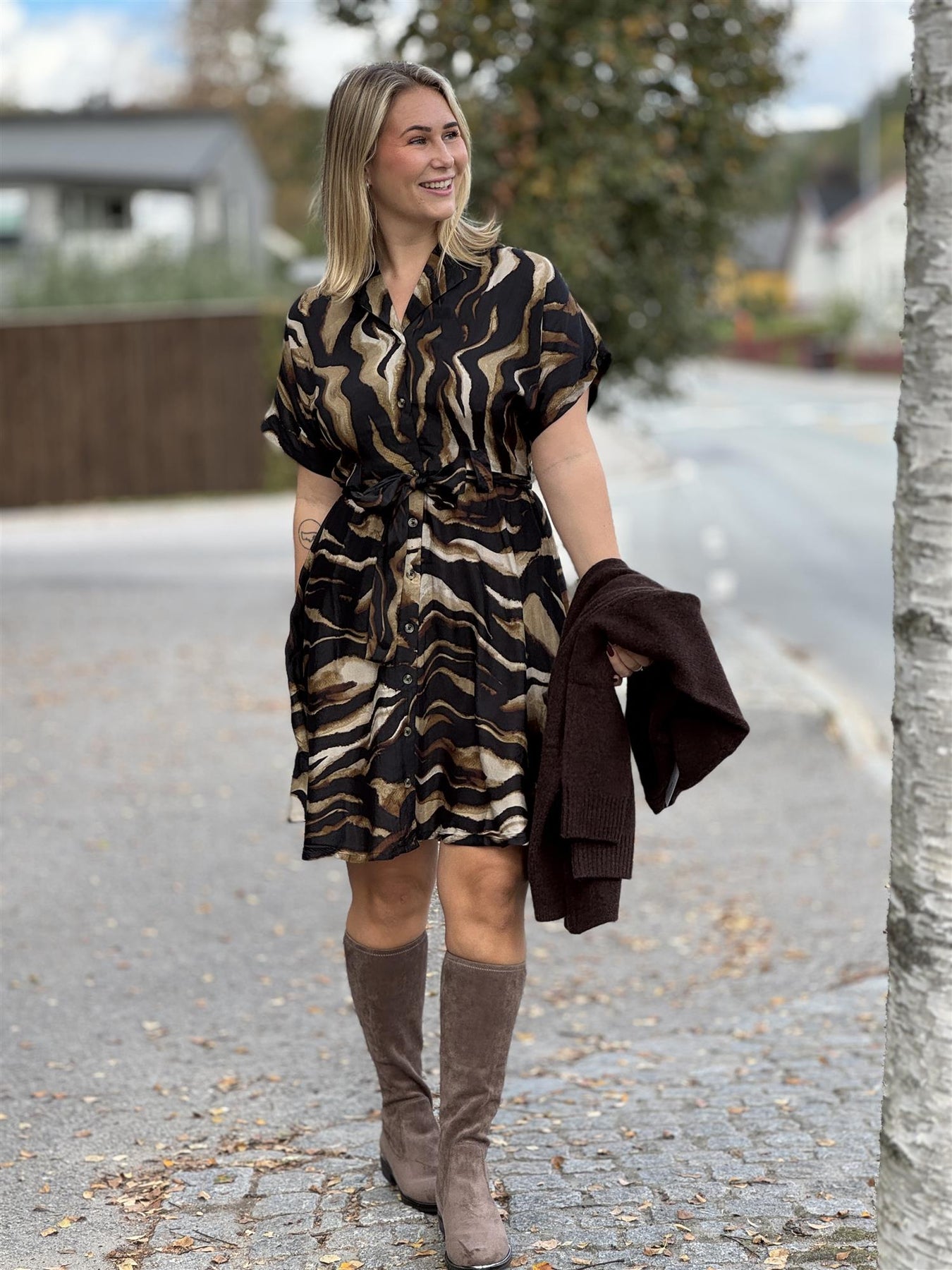 Kjole fra kaffe med v-hals, knepping hele veien ned og knytting i livet. Deilig og kul viskose kjole det er mye bruk i.