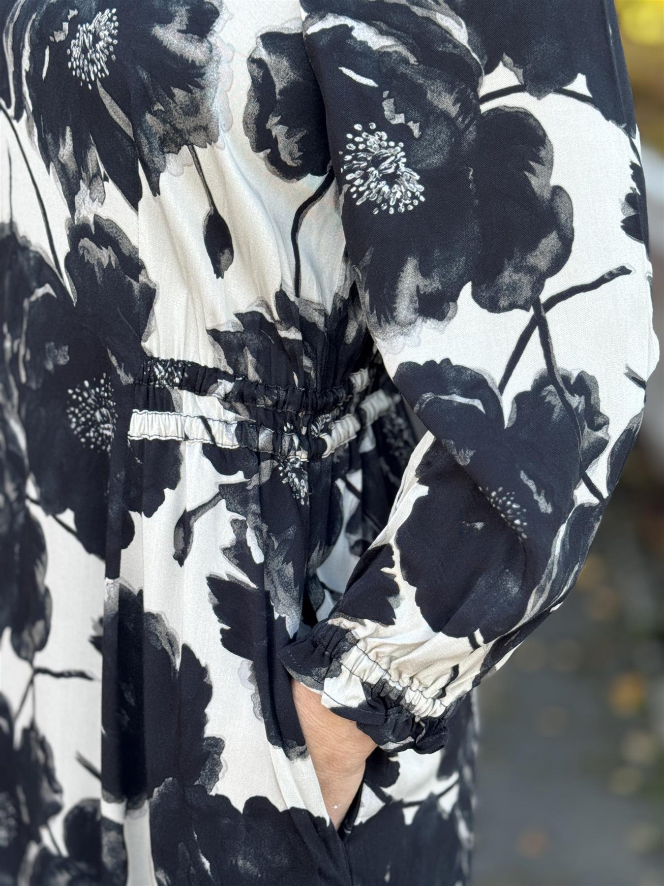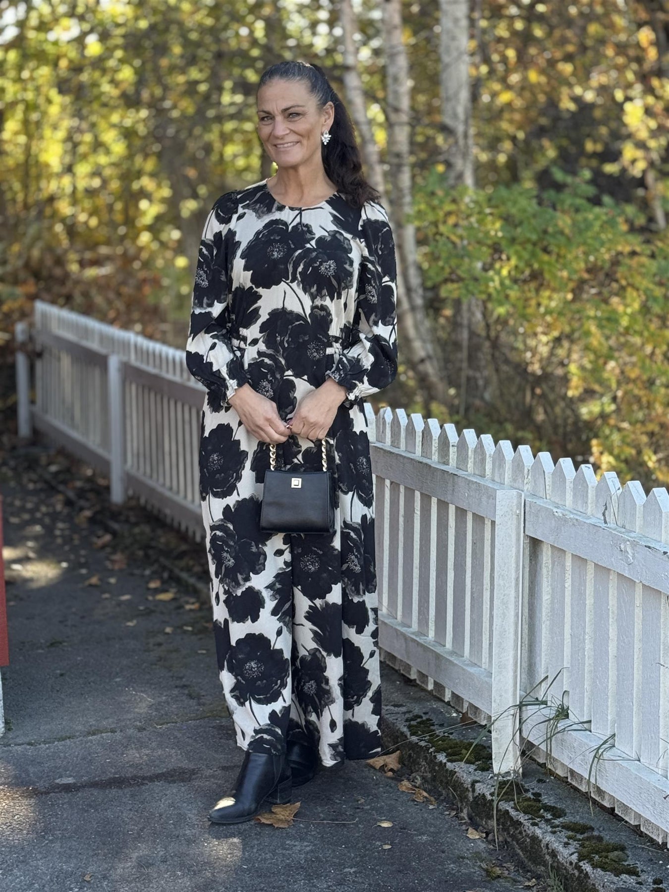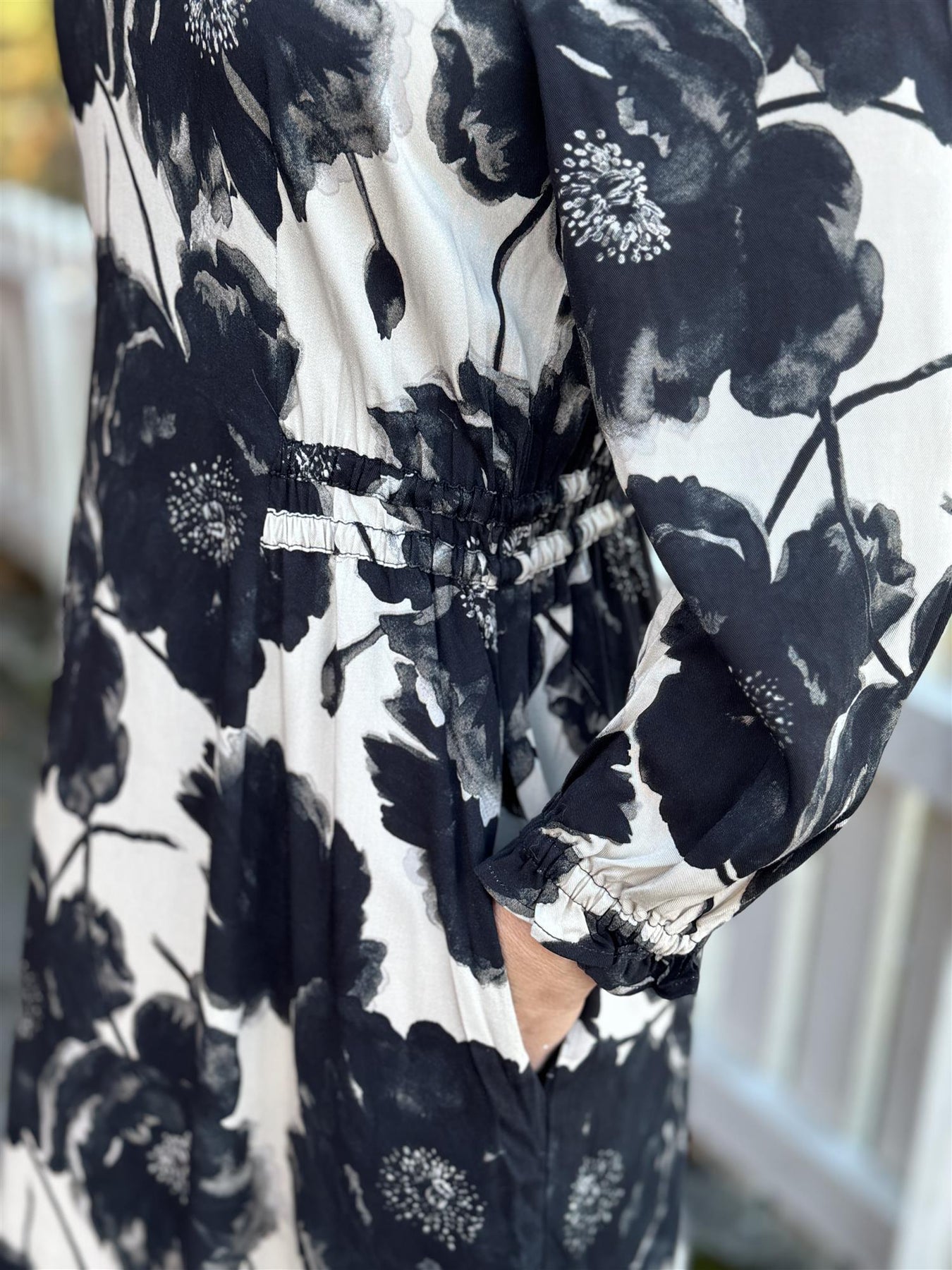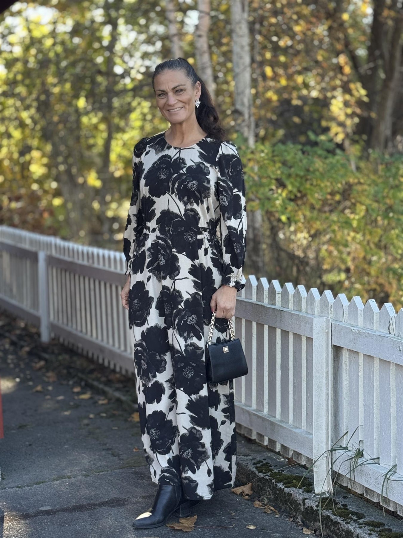 Kjolen har et vakkert blomsterprint i sort og beige som gir et tidløst og feminint uttrykk. Den runde halsen og ankellange lengden gjør at kjolen kler både hverdag og fest.