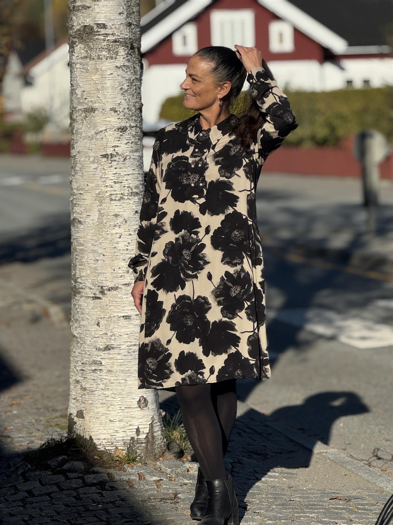 Den har klassisk skjortekrage, knepping med dekorative perleknapper og lange ermer med mansjett. Passformen er rett og avslappet, og lengden går til rett over kneet – noe som gjør den utrolig anvendelig året rundt.