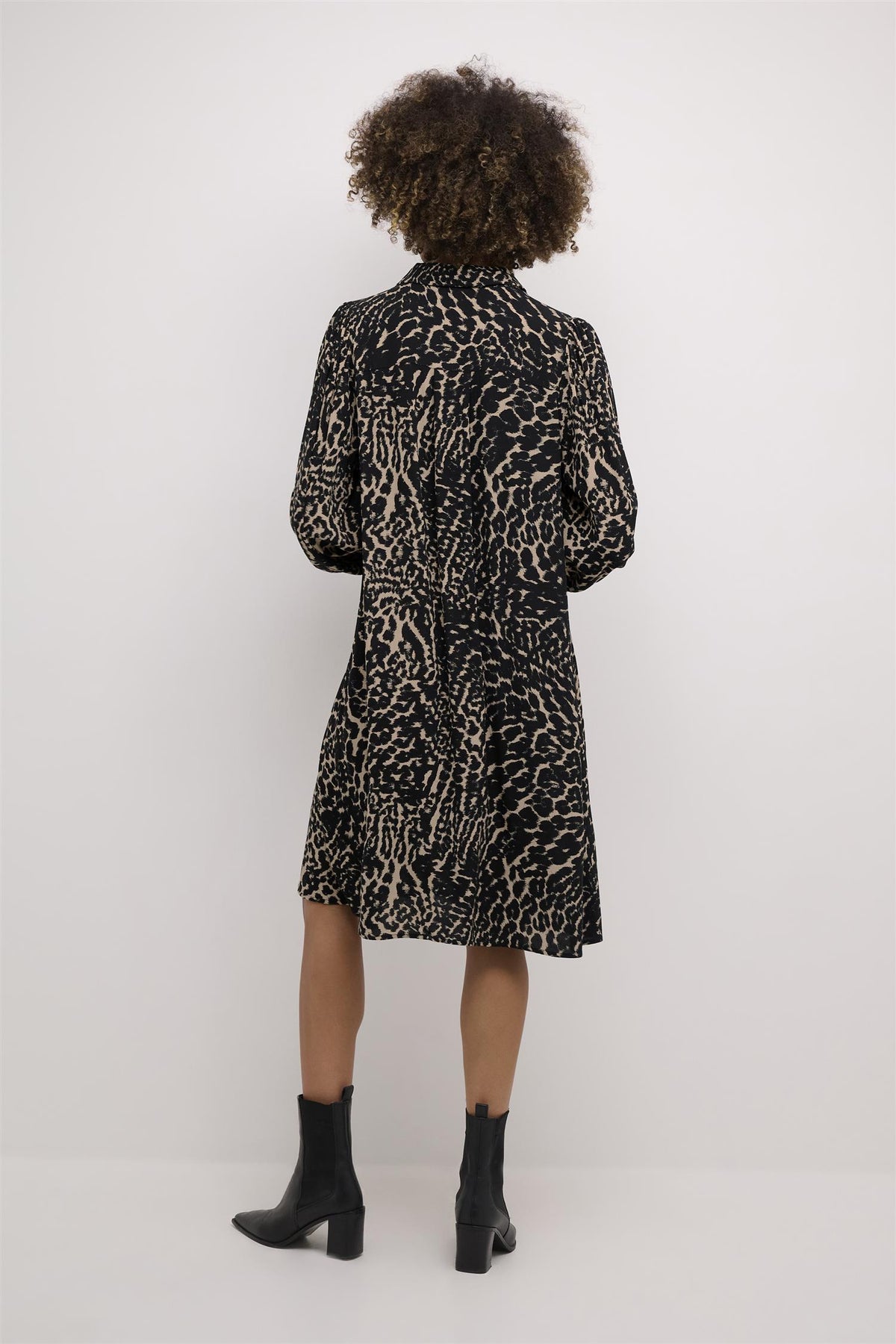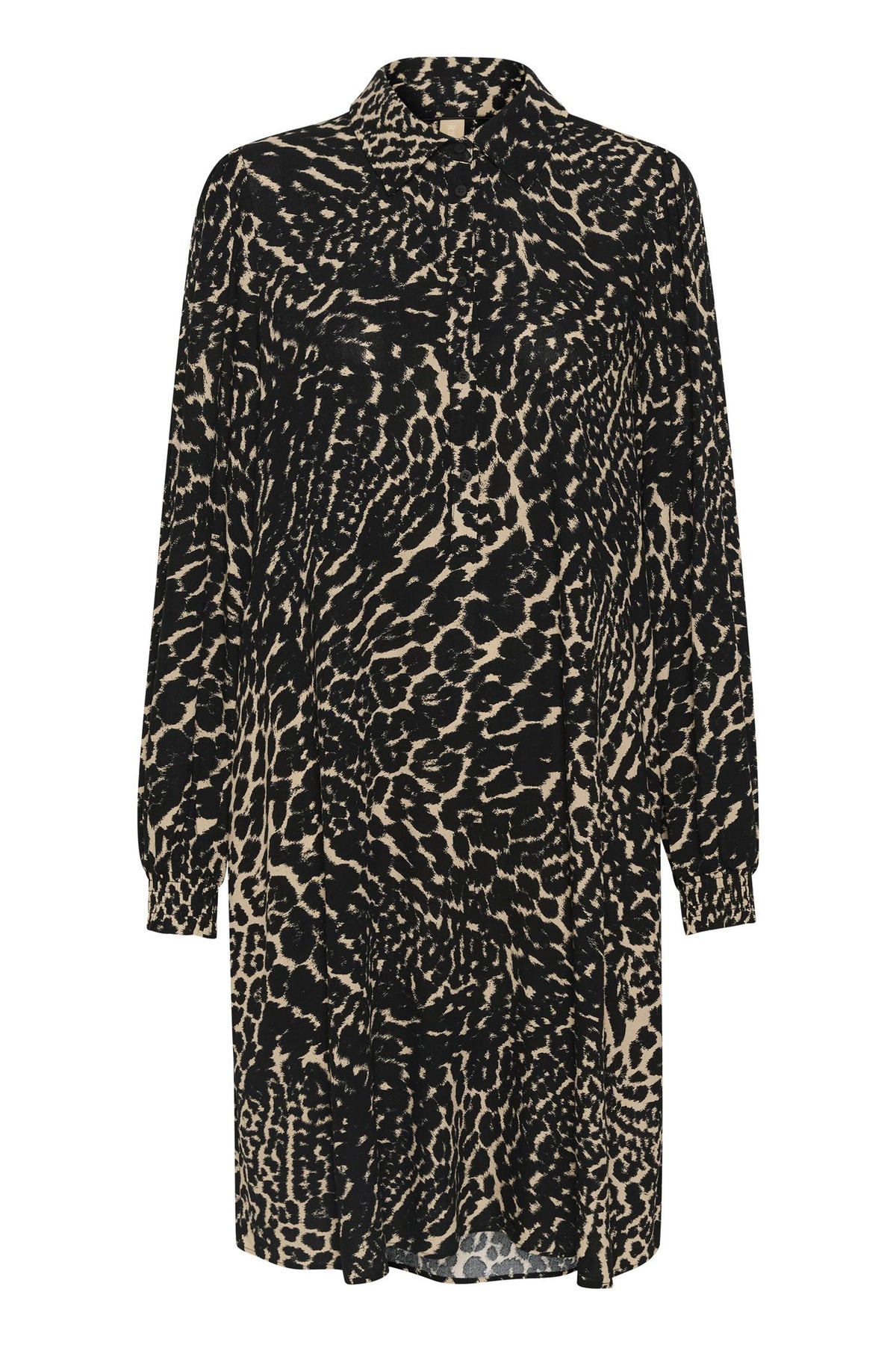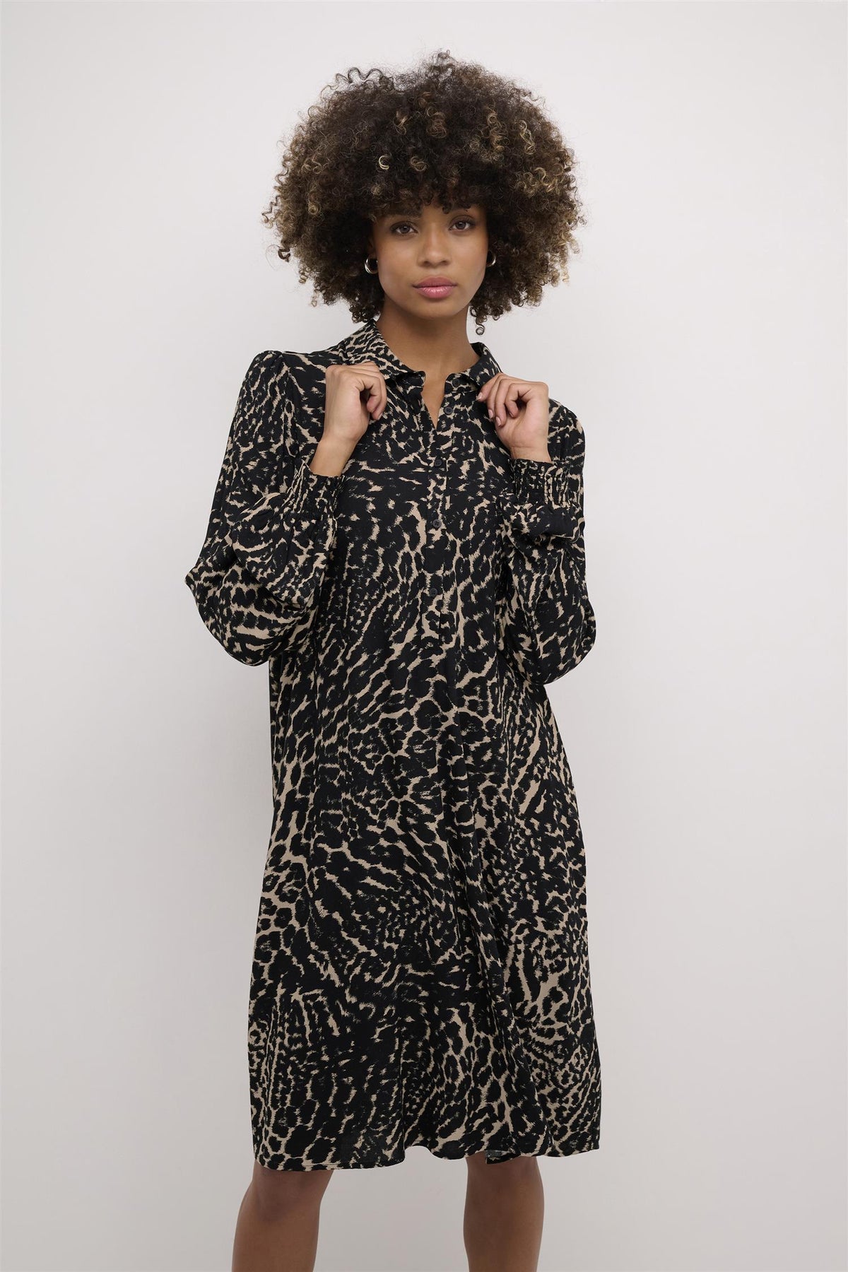 Denne leopardmønstrede kjolen gir deg et tøft og stilig uttrykk med minimal innsats! Den avslappede passformen og lange ermene gjør den superkomfortabel til både hverdagsbruk og mer pyntede anledninger. Med lommer i sidene og et klassisk snitt er den både praktisk og trendy. Perfekt å style med boots for et kult hverdagsantrekk, eller kombiner den med hæler for en mer sofistikert look til fest. Dette er kjolen for deg som vil føle deg både avslappet og trendy, uansett hva dagen bringer!