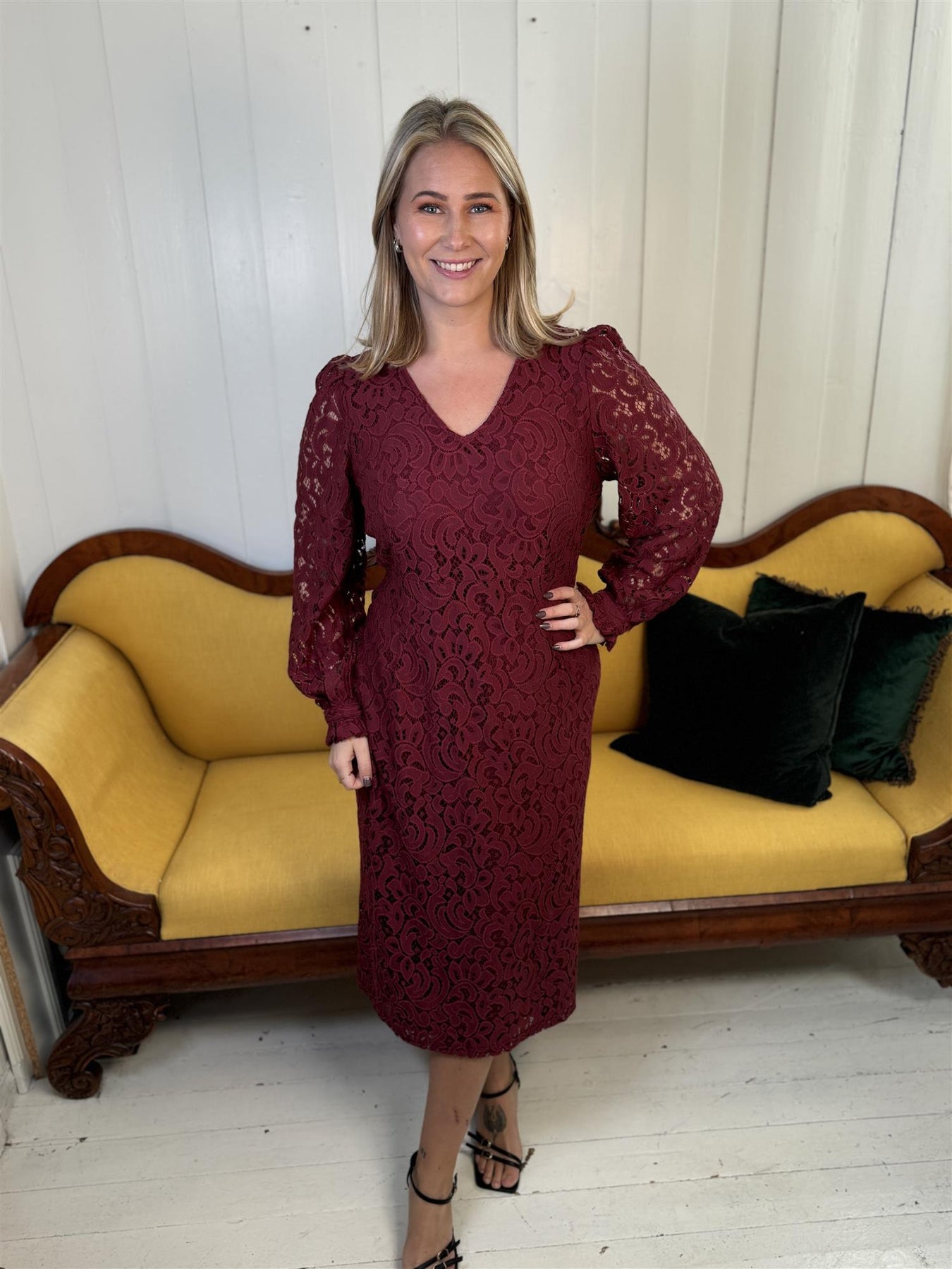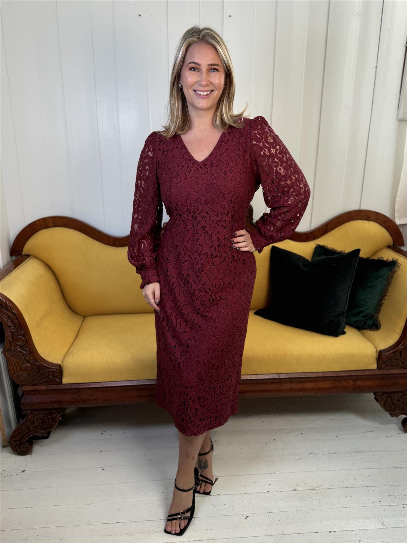 De lekre blondene gir et romantisk preg, mens den dype vinrøde fargen gjør at kjolen passer perfekt til høst, jul og festlige kvelder. Mansjettene på ermene gir en ekstra feminin detalj, og lengden gjør at den er enkel å style både med pumps og boots.