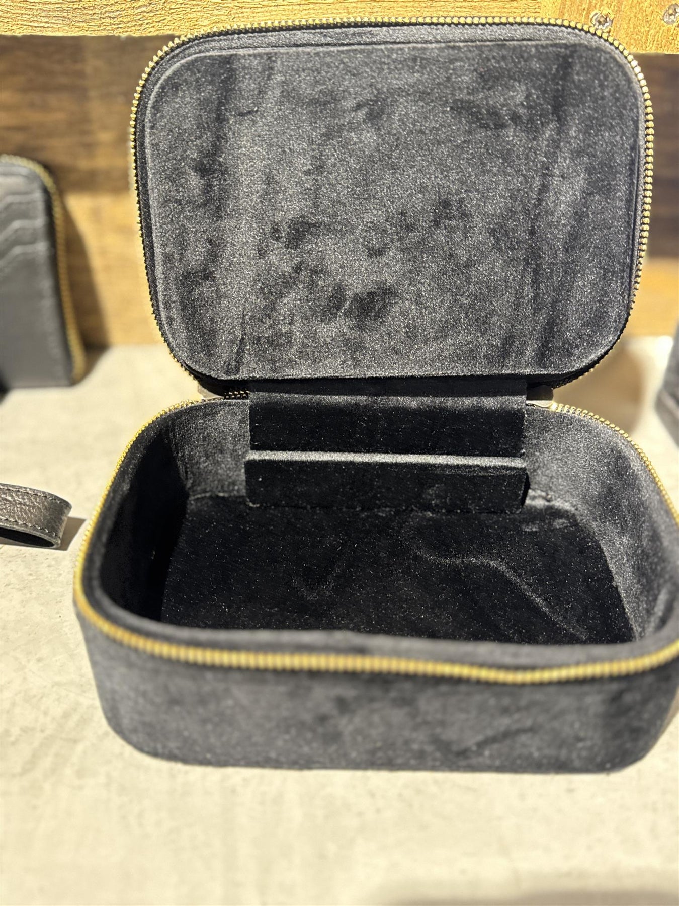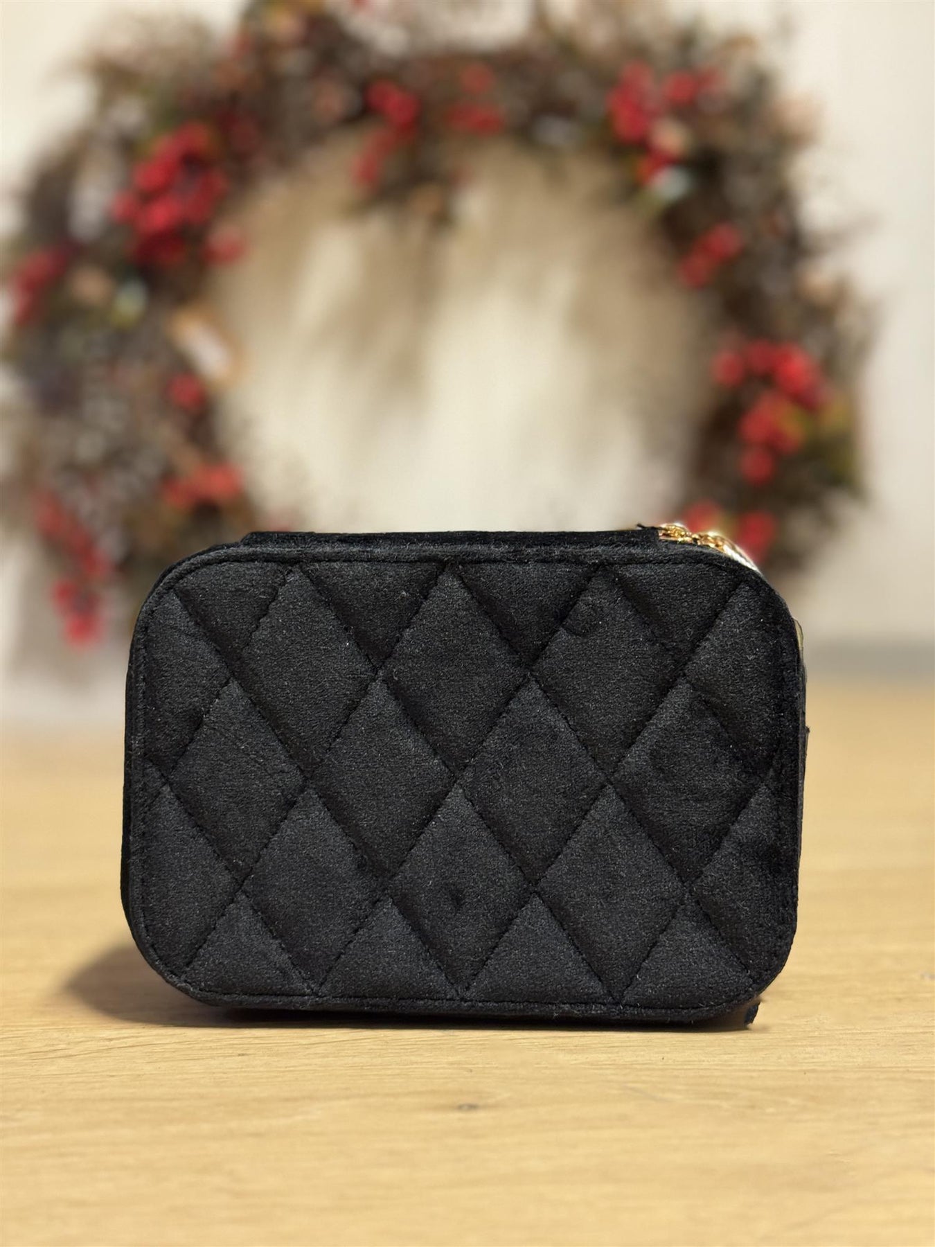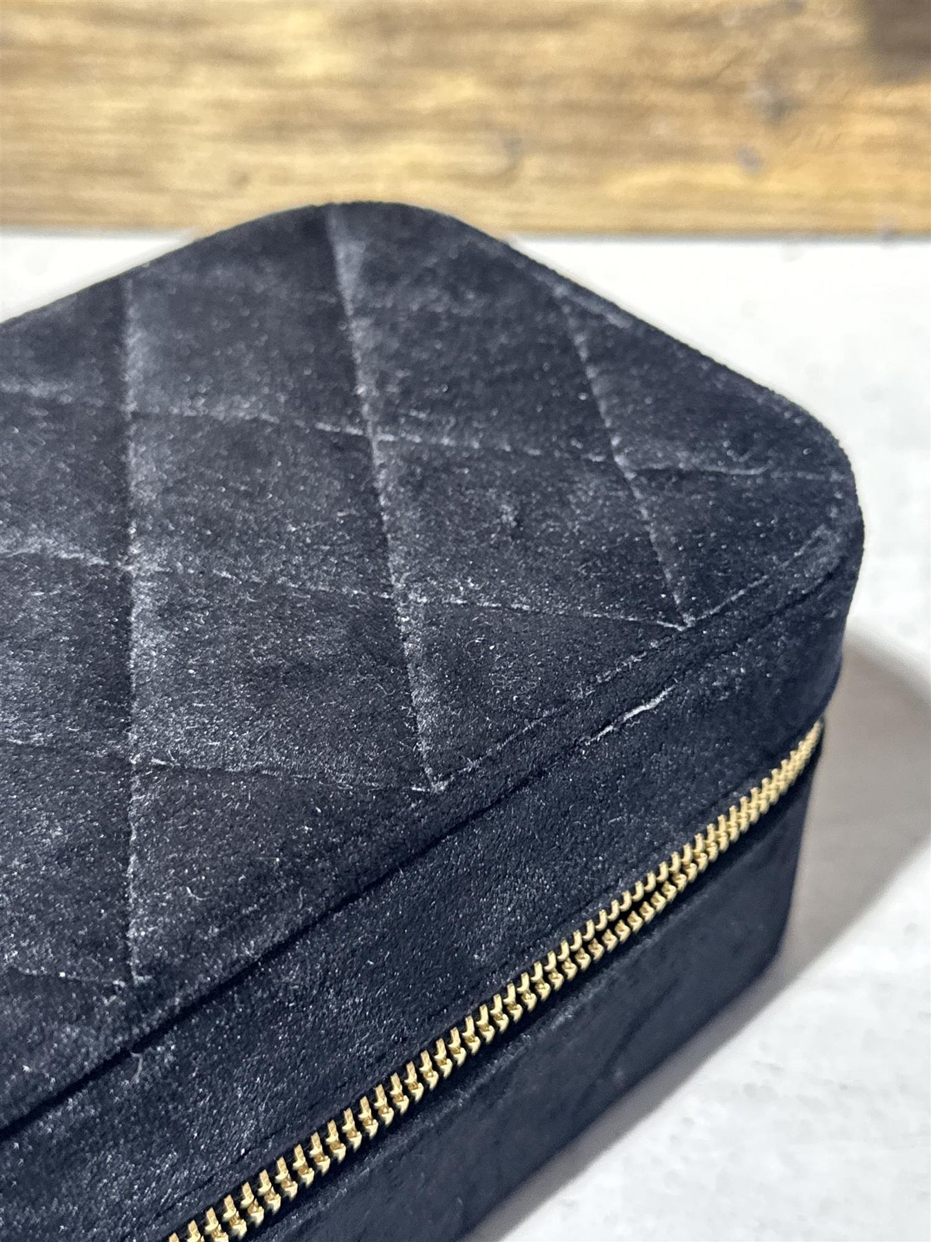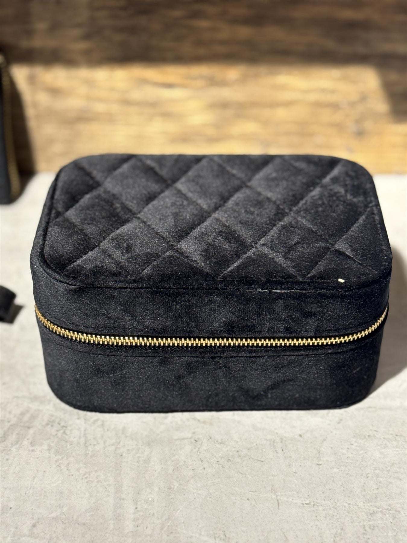 Gi smykkene dine et fint og trygt hjem med dette finw smykkeskrinet i sort velvet fra Nora Norway. Den myke velouroverflaten, quiltet lokk og gullfarget glidelås gir et elegant uttrykk som passer perfekt både på soverommet og badet.