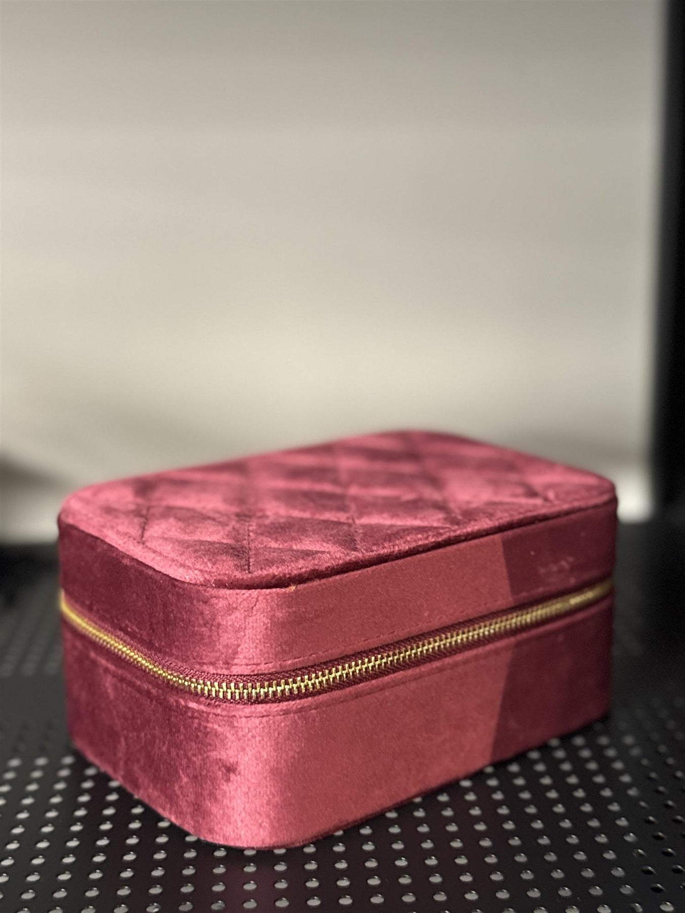 Gi smykkene dine et fint og trygt hjem med dette fine smykkeskrinet. Den myke velouroverflaten, quiltet lokk og gullfarget glidelås gir et elegant uttrykk som passer perfekt både på soverommet og badet.