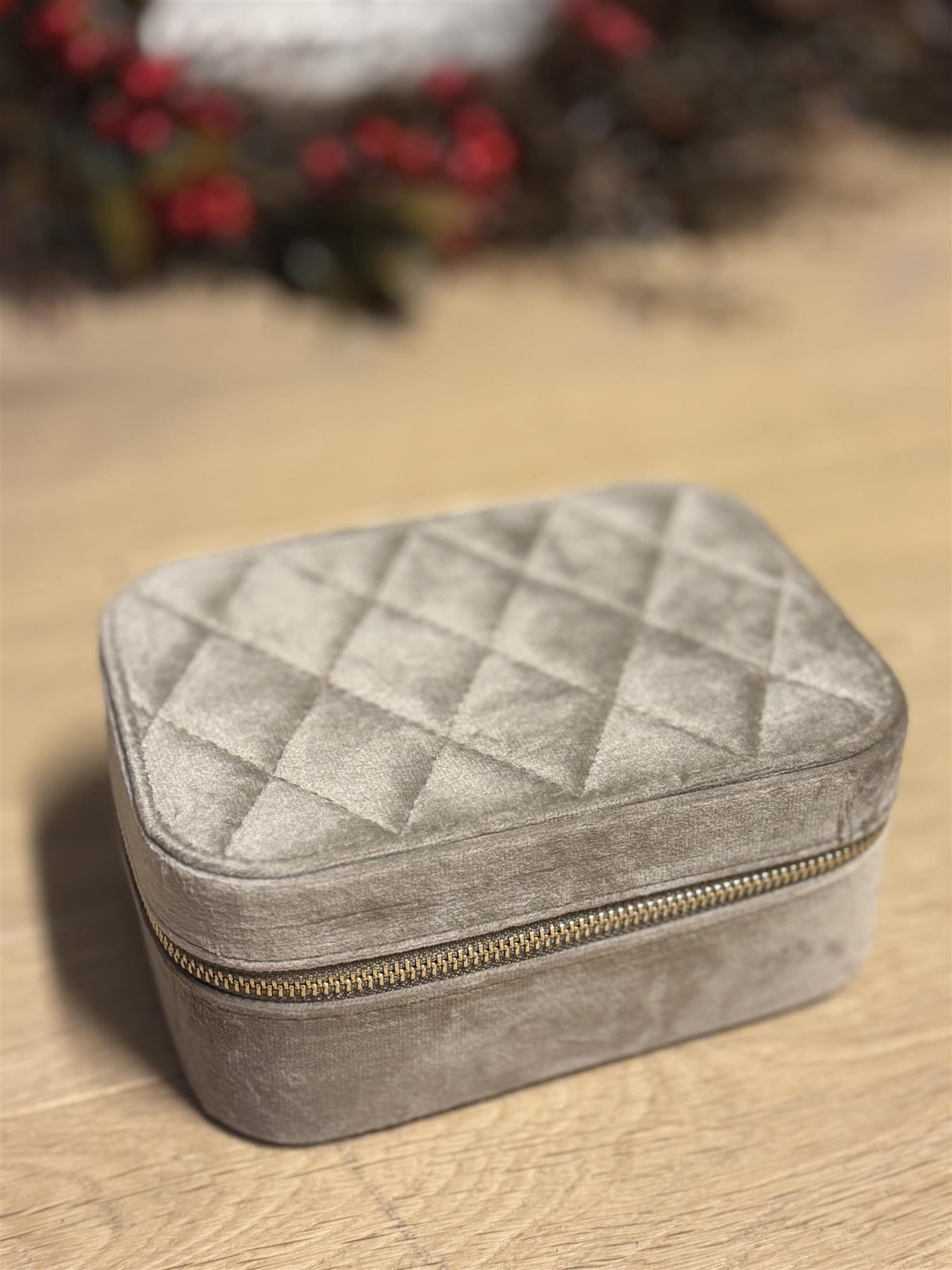 Gi smykkene dine et fint og trygt hjem med dette fine smykkeskrinet. Den myke velouroverflaten, quiltet lokk og gullfarget glidelås gir et elegant uttrykk som passer perfekt både på soverommet og badet.