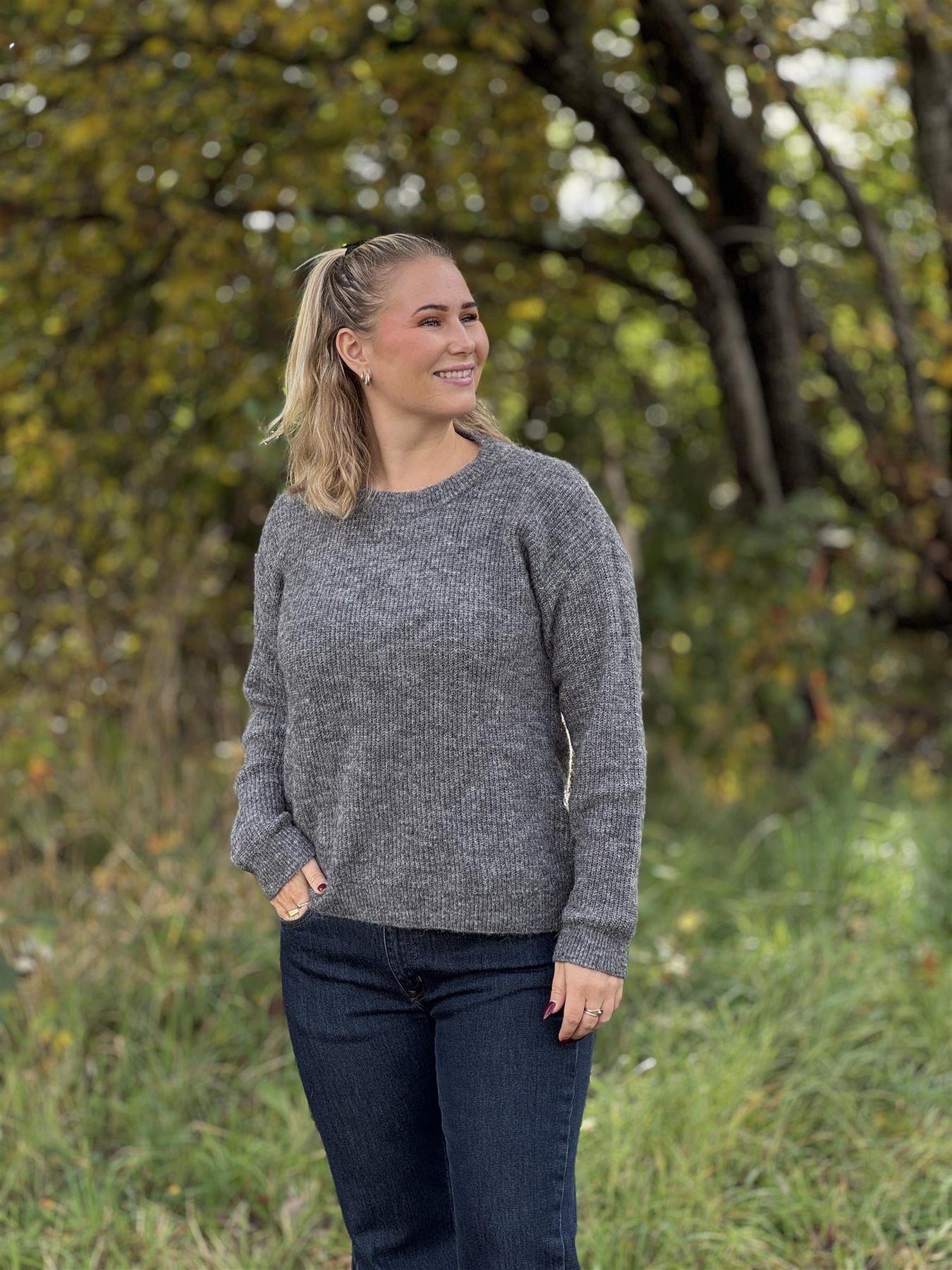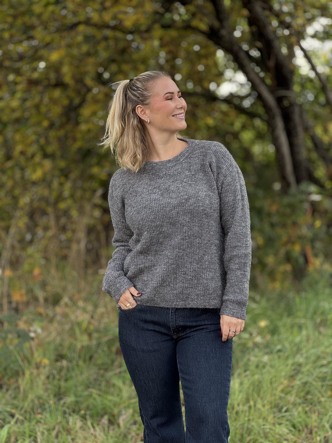 Grå strikket basisgenser i ullmix. Denne genseren er super hele året, på kjølige sommerkvelder - og på den kalde årstiden.