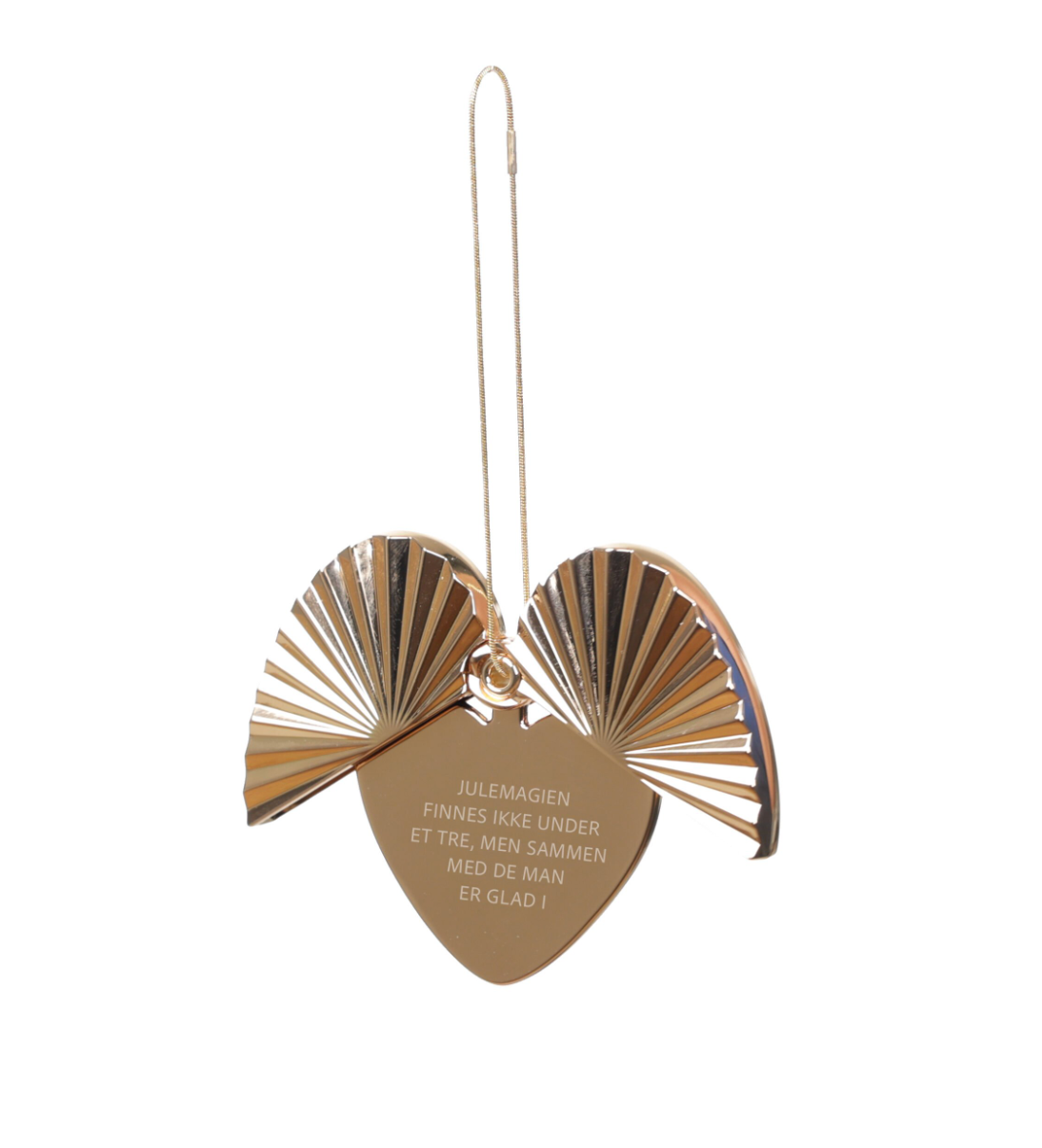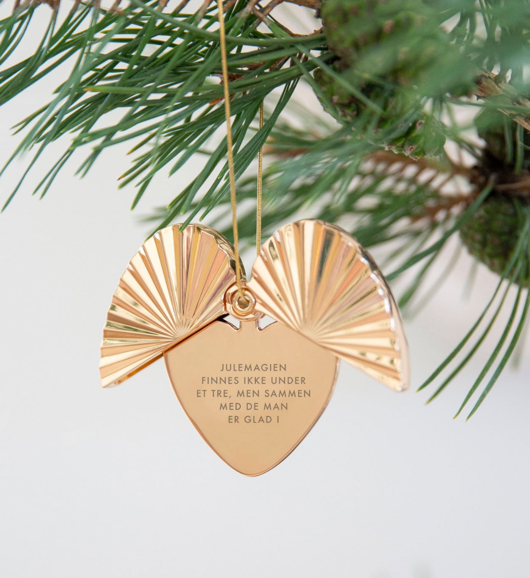 Ornamentet kan henge både lukket eller åpent, slik at de vakre “vingene” rammer inn hjertet og teksten. Designet av Solgunn Stensig for Pictureit.no, produsert i metall og forgylt med 14 karat gull. Dette er en personlig gave som blir tatt frem år etter år – og som mange samler på. Hver jul lanserer vi en ny variant i serien.