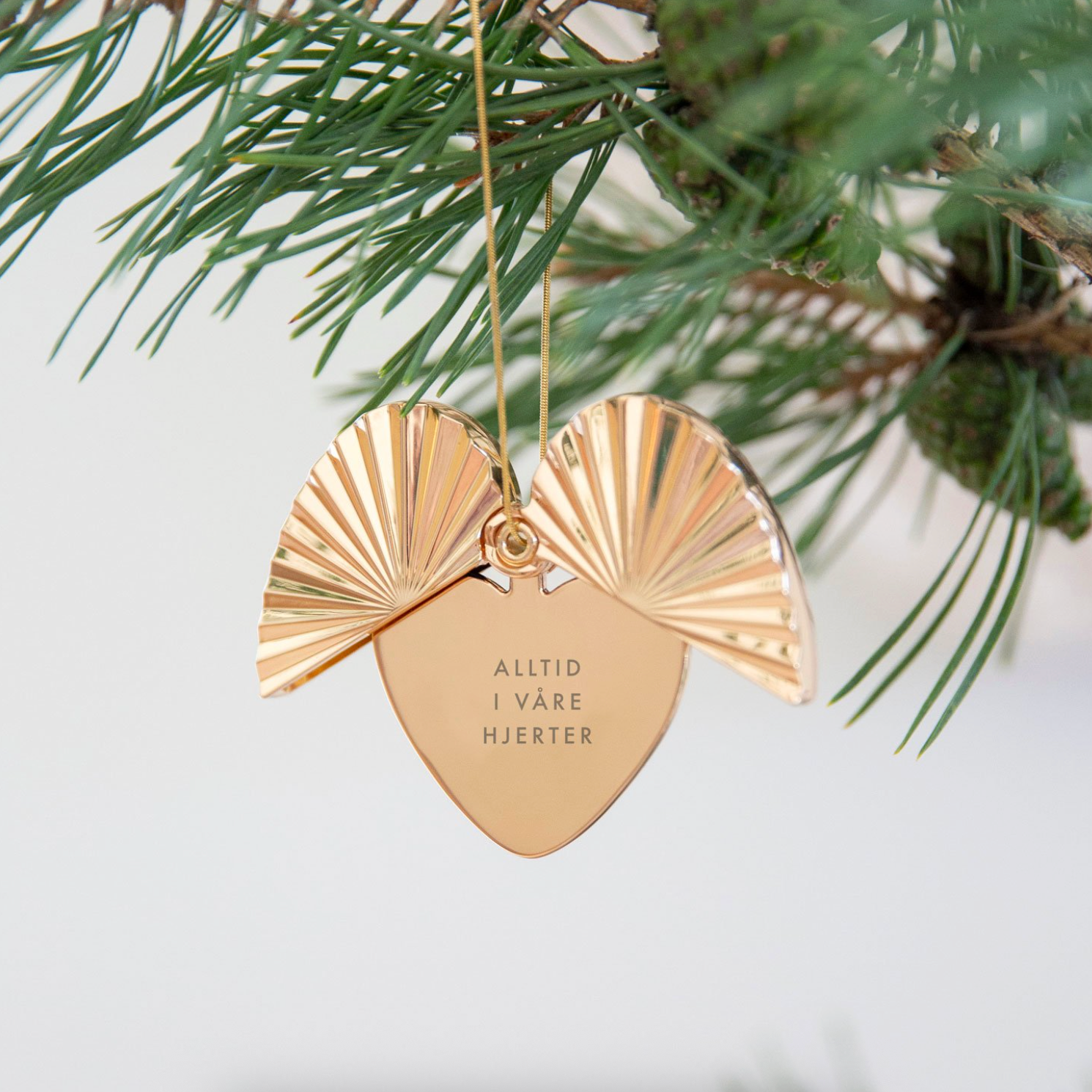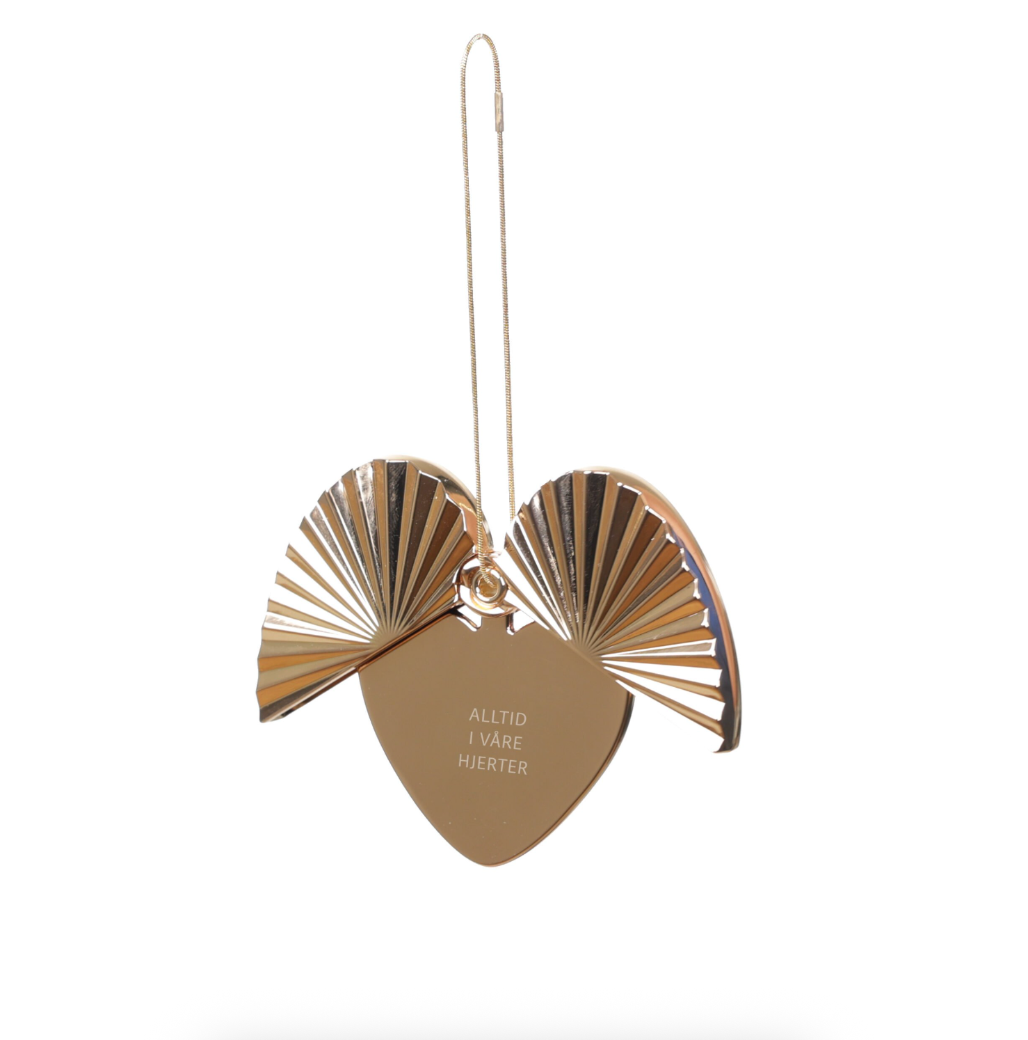 Symbolikken mellom englevingene og teksten gjør denne julepynten ekstra spesiell. Du kan henge ornamentet både lukket eller åpent, slik at vingene folder seg rundt hjertet og teksten kommer frem.