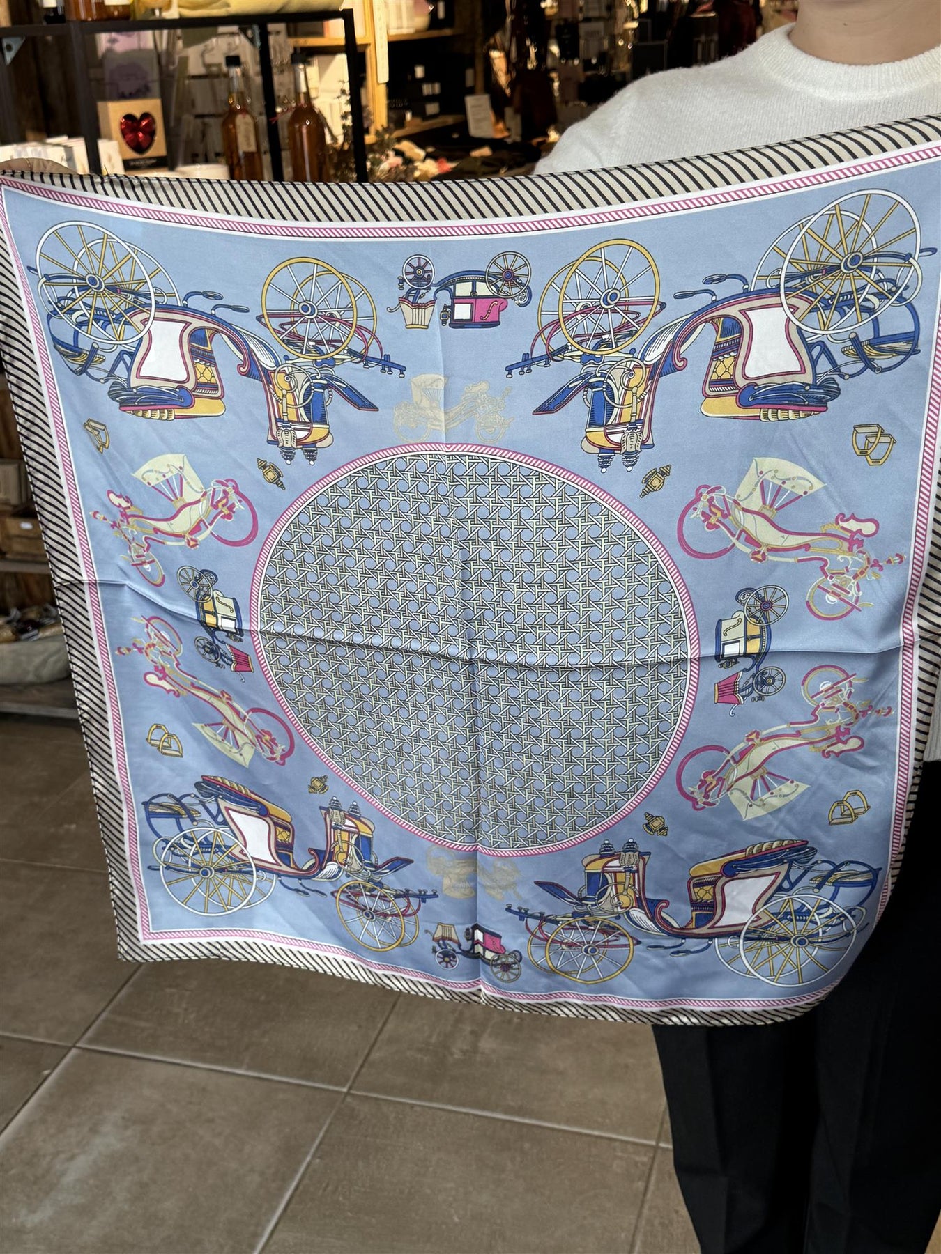 Et silkeskjerf i myk blåfarge med vintage-inspirert mønster. Her får du et skjerf som piffer opp antrekket.