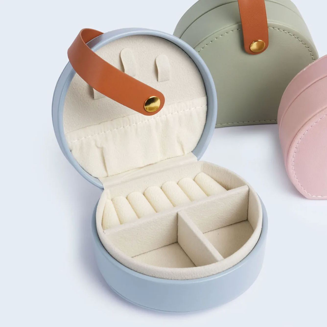 Hold orden på favorittsmykkene dine med denne fine, runde smykkeboksen i kunstskinn. Den er liten og nett – akkurat passe stor til å få plass i vesken eller kofferten, uten at smykkene dine blir flokete eller borte.