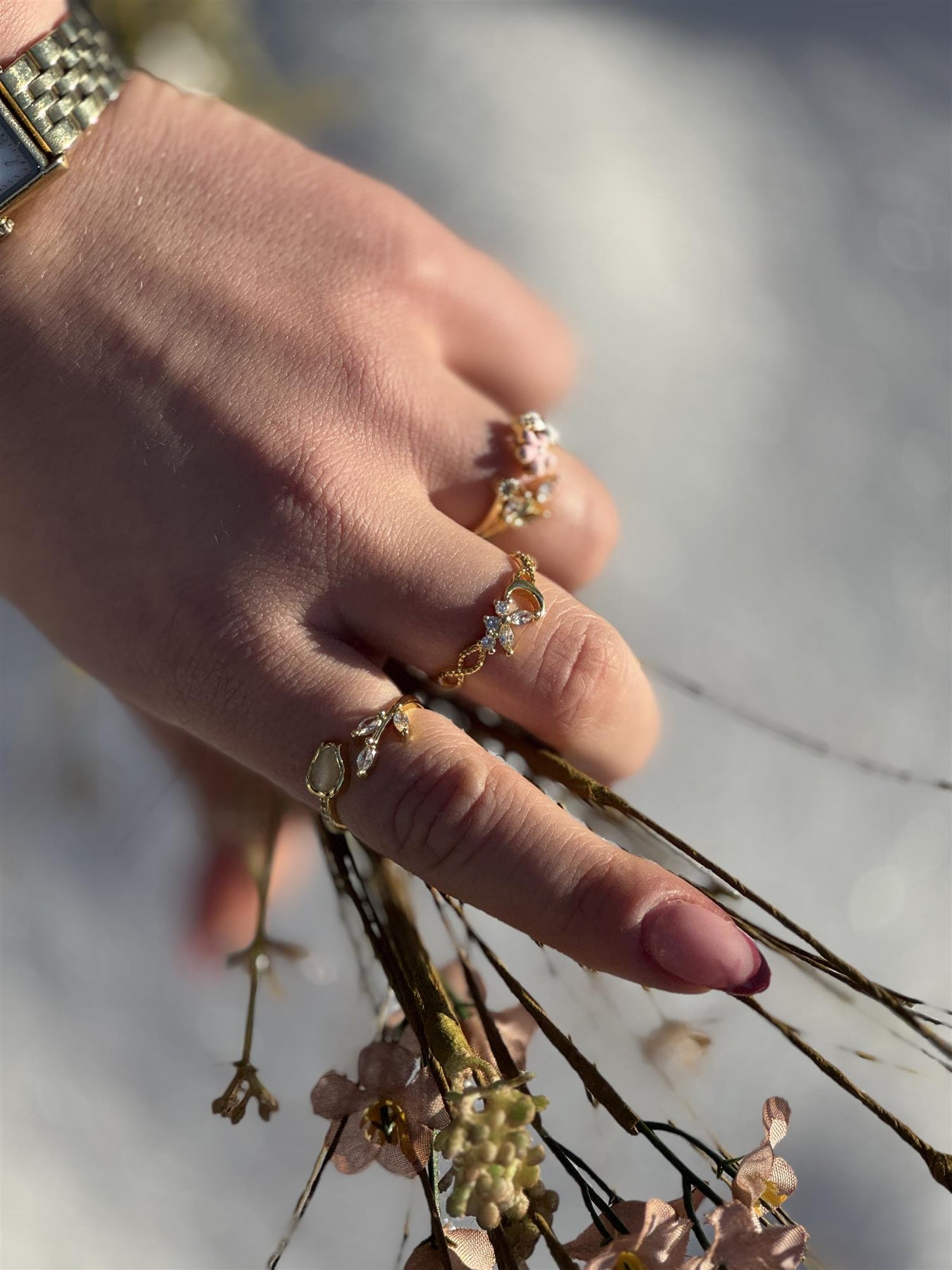 Sett med 3 ringer i gull – blomster og fine detaljer 🌸