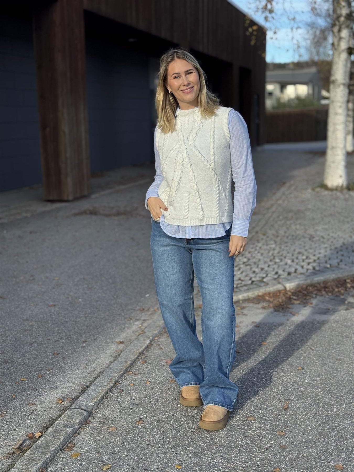 Gjør deg klar for høsten og vinteren med vår høyhalset vest med flettemønster! Denne vesten har 10% ull i seg, noe som gir både varme og komfort i de kaldere månedene.
