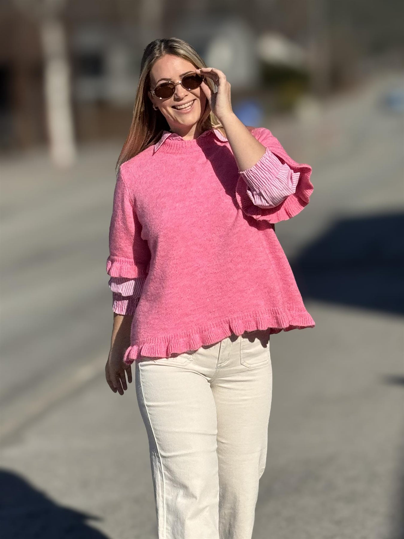 De små volangdetaljene på ermene og nederst på genseren gir plagget et ekstra feminint preg uten at det blir for pyntet. Den klassiske runde halsen gjør at genseren er tidløs og enkel å style – et plagg du kan bruke igjen og igjen.
