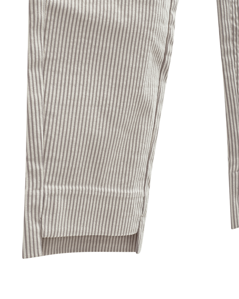 Buksen er laget i et mykt og stretchy materiale med diskrete striper som gir et pent og flatterende uttrykk. Den har høy midje, smal passform og ankellange ben med liten splitt nederst – en detalj som gjør buksen ekstra fin både til sneakers, loafers og hæler. Knapp- og glidelåslukking i front samt praktiske sidelommer gir en klassisk og anvendelig stil.
