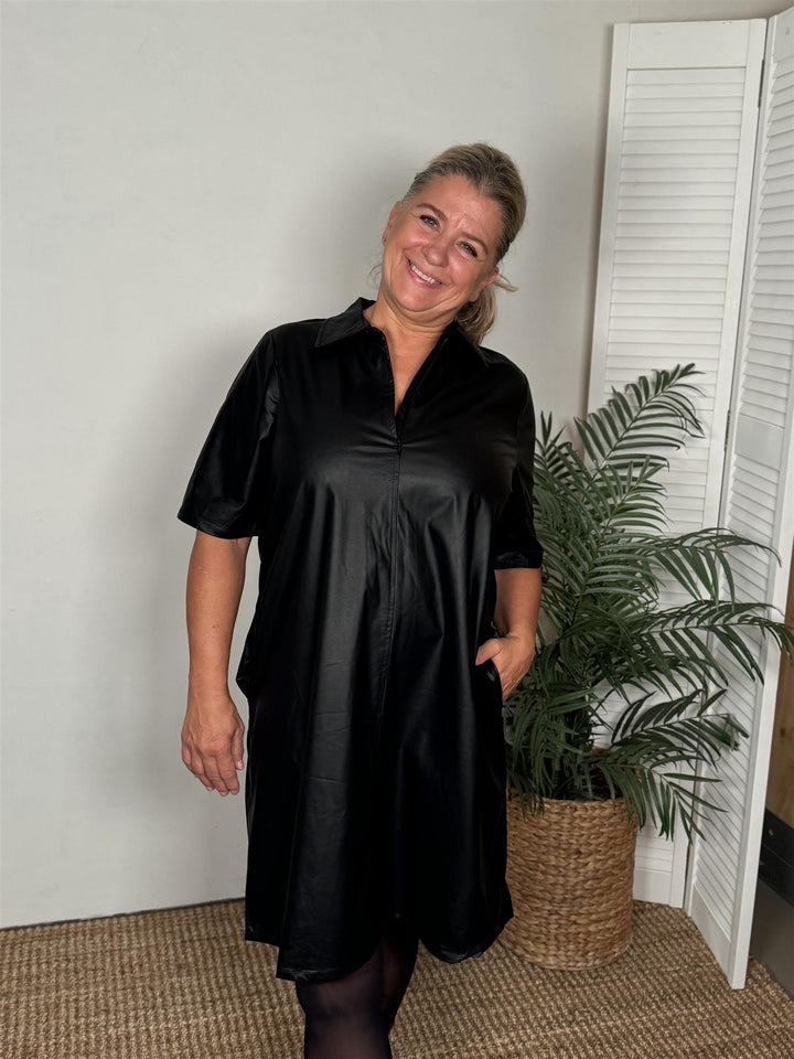 Råtøff kjole i viskose som ser ut som skinn. Myk og fin - faller fint. Dette er en kjole du lett styler tøft til både boots og joggesko - eller med pumps om du skal på fest. Linda har på seg str L er 110cm over bysten, 169cm høy. Normal i størrelsen.