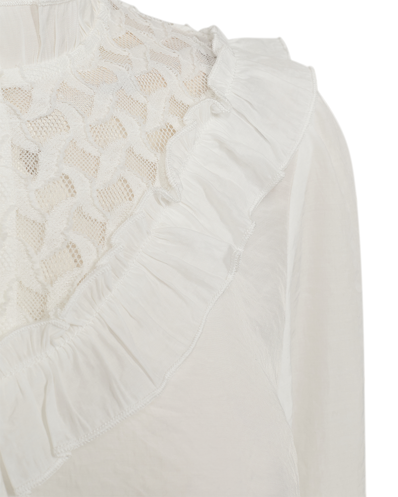 Bluse fra Freequent i et lett materiale med fine blonder og volanger på toppen. Blusen har lange ballongermer med elastiske mansjetter, en splitt med en enkelt knapp foran samt en elegant, uformell fit.
