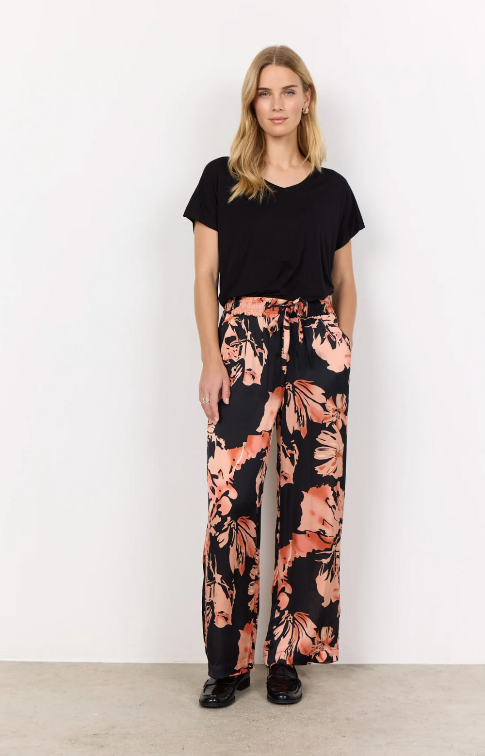 SC-PEACH 3-B bukser er laget av en myk og behagelig viskose kvalitet. De har en avslappet passform, elastisk midje med justerbare snorer og et vakkert blomsterprint. Style dem med en ensfarget topp og dine favorittsko, eller kombiner dem med den matchende overdelen for en gjennomført look. Her kan du få ett sett om du liker det!