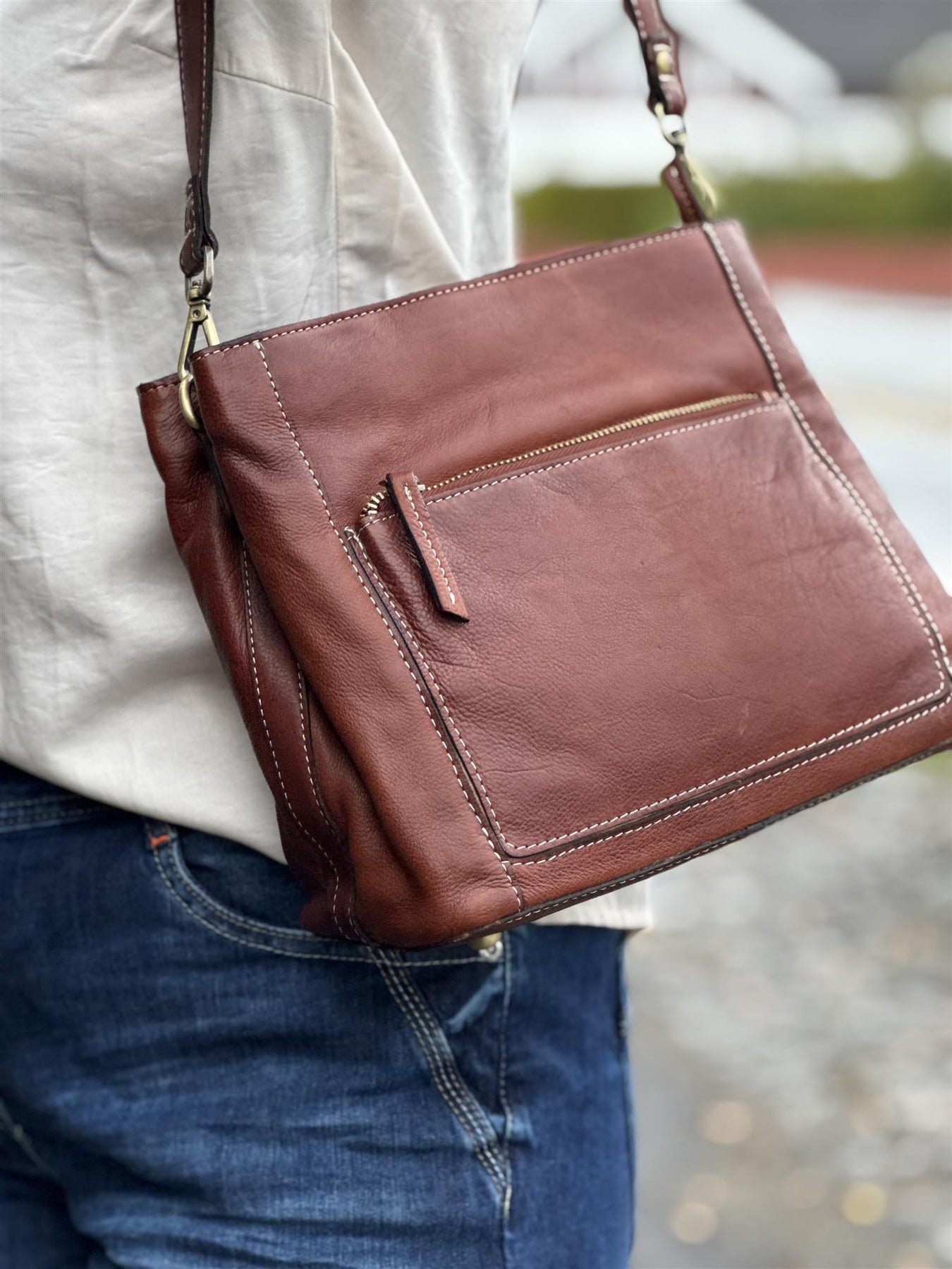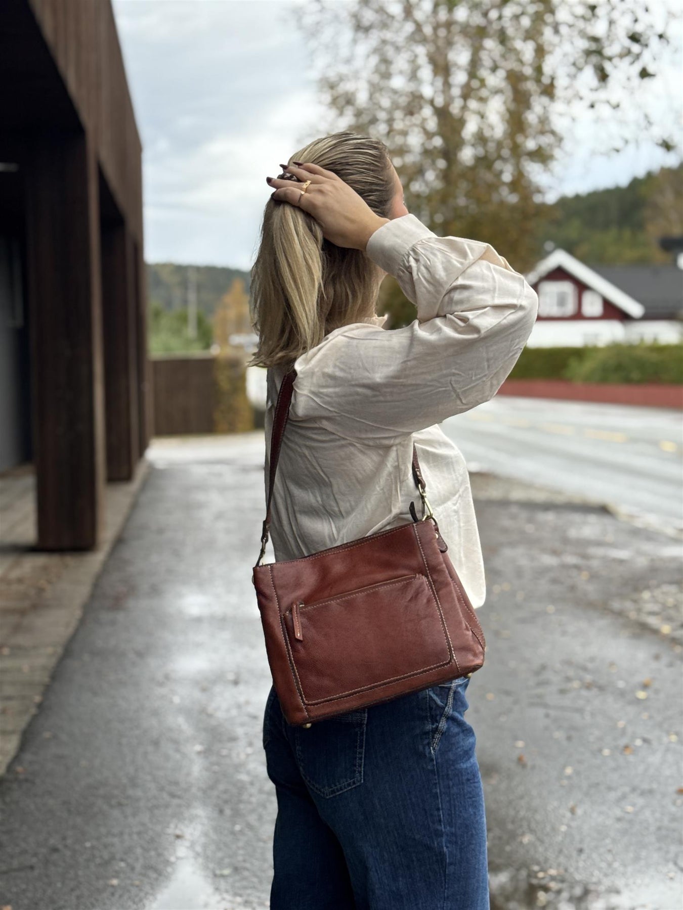 På forsiden finner du en praktisk glidelåslomme – perfekt til nøkler, mobil eller småting du vil ha lett tilgjengelig. Inni vesken er det et romslig hovedrom med god plass til alt du trenger på farten – fra lommebok og mobil til små sminkesaker og notatbok.