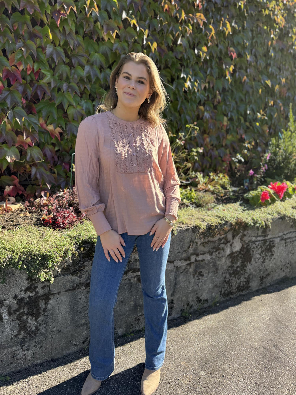 Bluse fra Freequent i et lett, strukturert materiale. Blusen har en enkel silhuett med knappelukking, lange ballongermer med en smock-detalj på mansjetten, en elegant, avslappet passform og blonder foran.