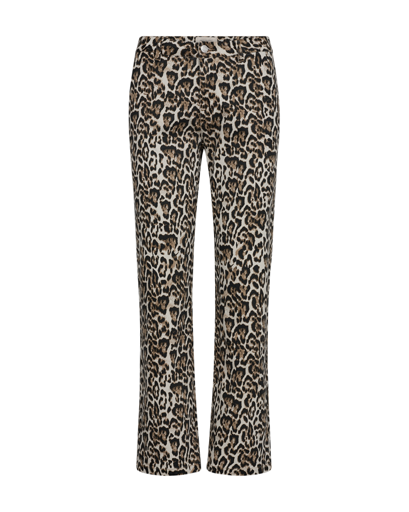 Bukse i et flott leopardmønster i brune nyanser. Buksene har rette ben og skrålommer. De lukkes med glidelås og knapp, og har i tillegg beltehemper. Buksene har god stretch og er svært behagelige å ha på.