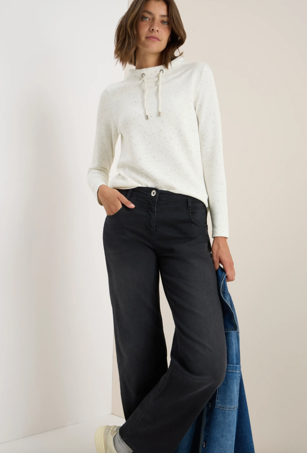 En tidløs og behagelig hverdagsfavoritt! Denne langermede genseren fra CECIL kommer i et lekkert hvitmelert stoff med et diskré prikkemønster som gir en moderne og sporty touch. Den feminine funnel neck-kragen med snøring setter prikken over i-en og gjør genseren både praktisk og stilig.