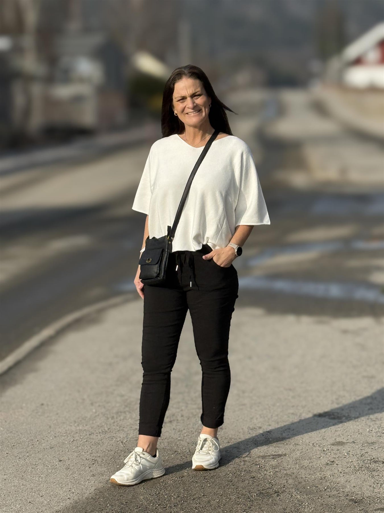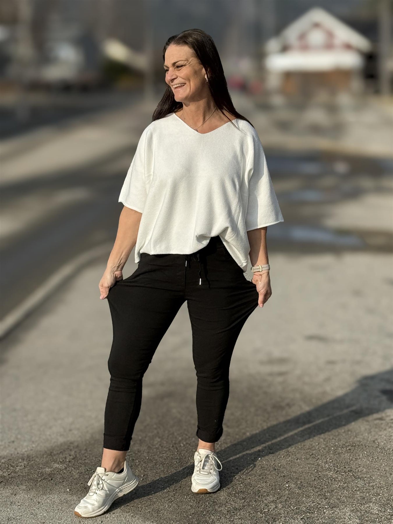 Enkel å style med bluse, t-skjorte, strikkegenser eller tunika.
