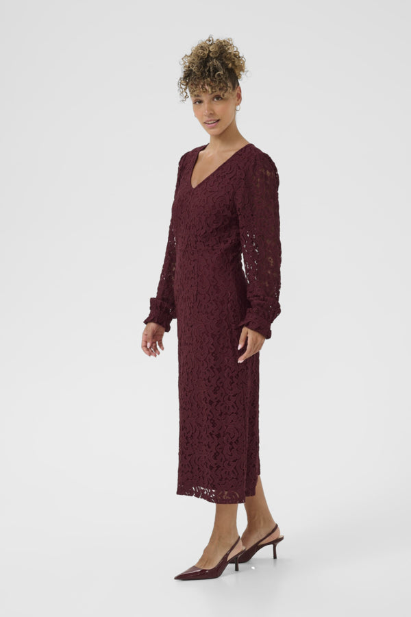 En nydelig kjole til alle de fine anledningene! Denne vinrøde blondekjolen fra Cream har et tidløst snitt med v-hals, lange ermer og midi-lengde som gjør den både elegant og behagelig å bruke.