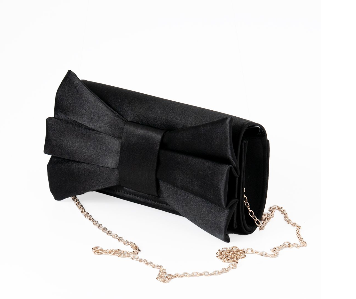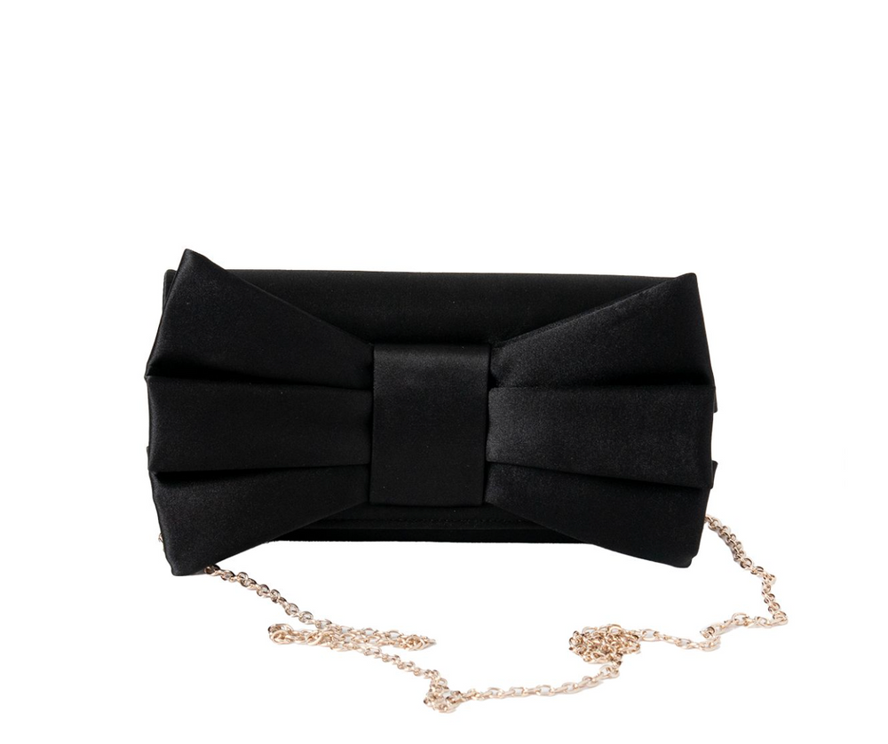Stilren selskapsveske med stor sløyfe. Vesken er kledd i sateng stoff og lukking med flipp og magnetknapp. Vesken har 1 stort rom og en stikklomme på ene siden. Følger med avtagbar skulderlenke i sølvfarget metall.