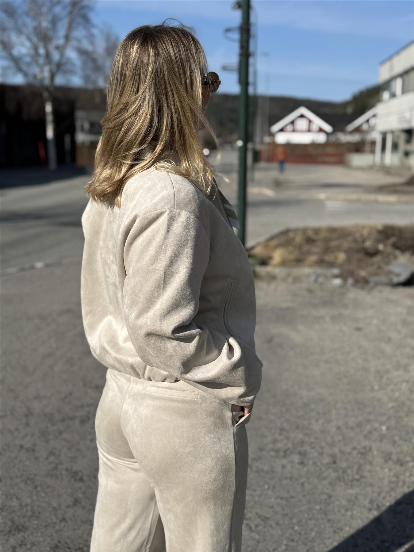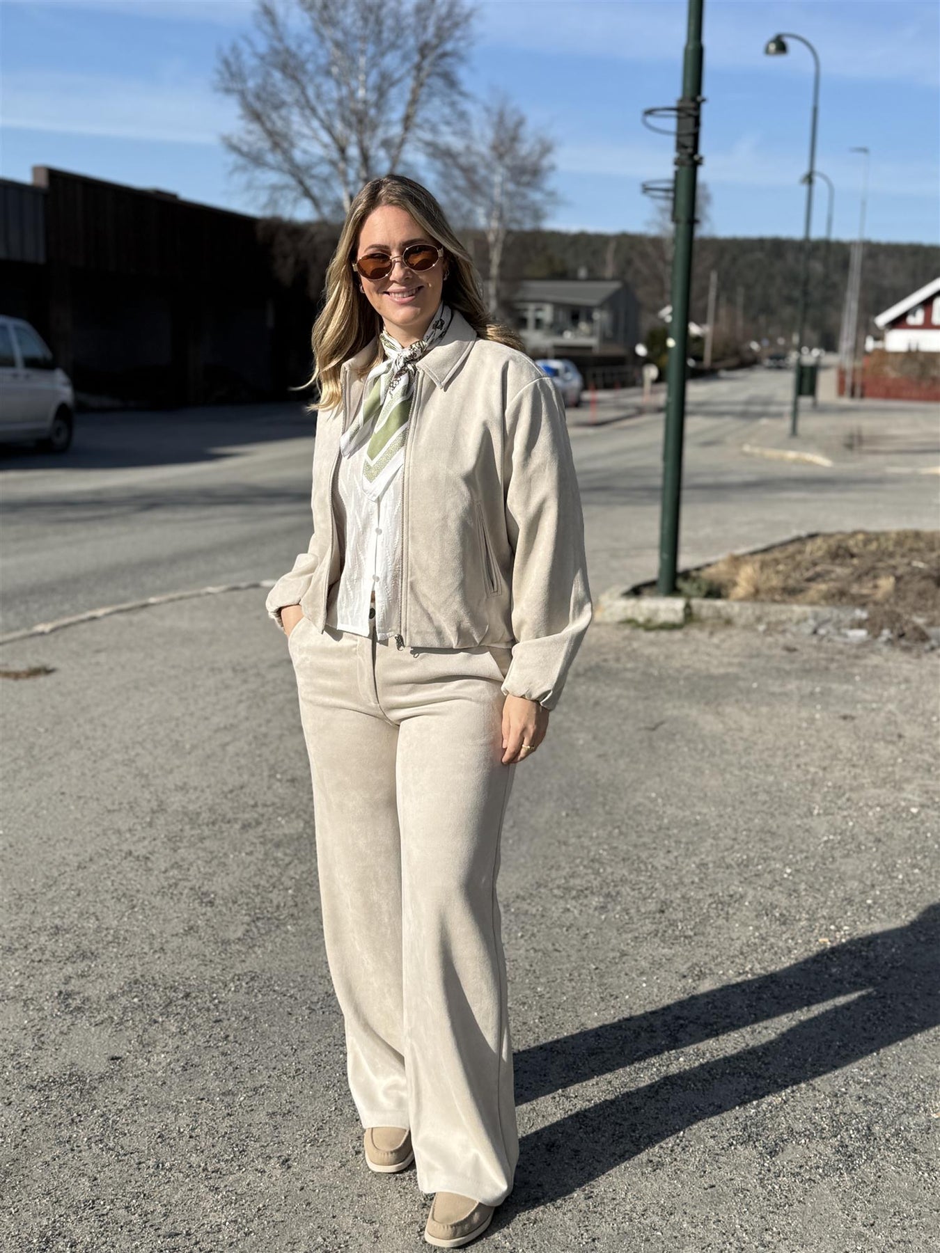 Den lyse, rene fargen gjør den enkel å matche med alt fra strikkegenser og t-skjorte til blazer og bluse. Medium høy midje, lommer i siden og beltehemper gir et klassisk uttrykk med god passform.
