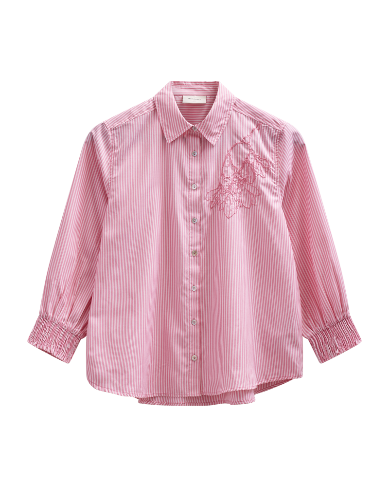 De ¾-lange ermene med smock-mansjett gir et mykt og feminint uttrykk, og den broderte detaljen på brystet gjør skjorten litt ekstra uten å bli for pyntet. Den fine rosafargen med striper er fresh, flatterende og enkel å kombinere.