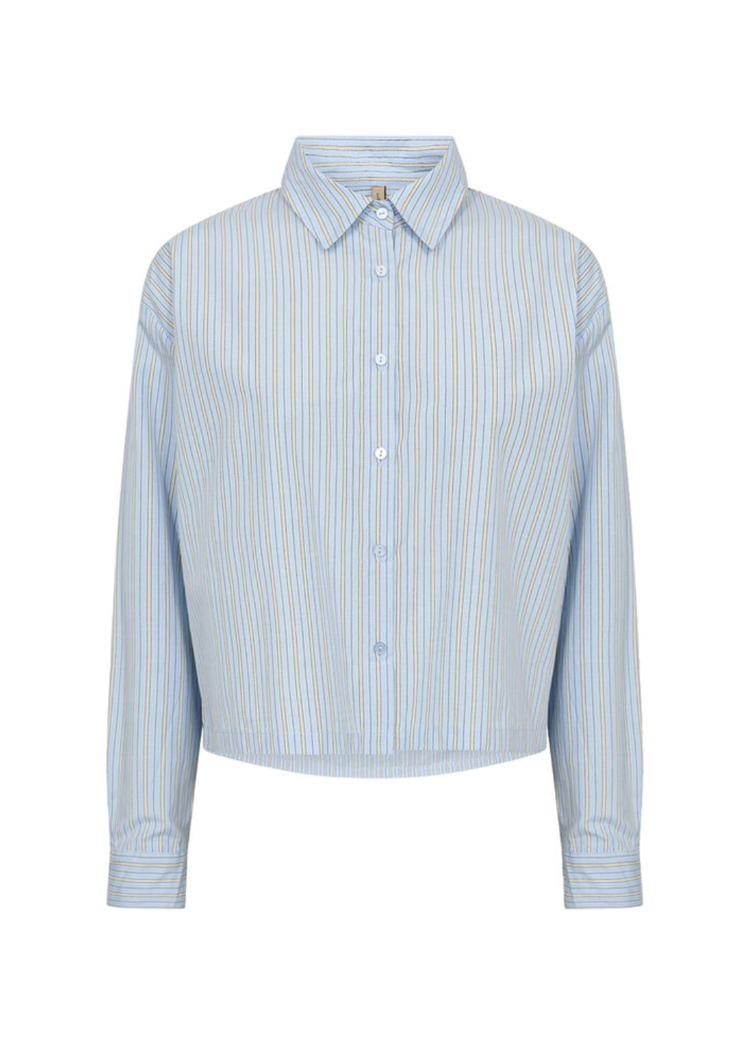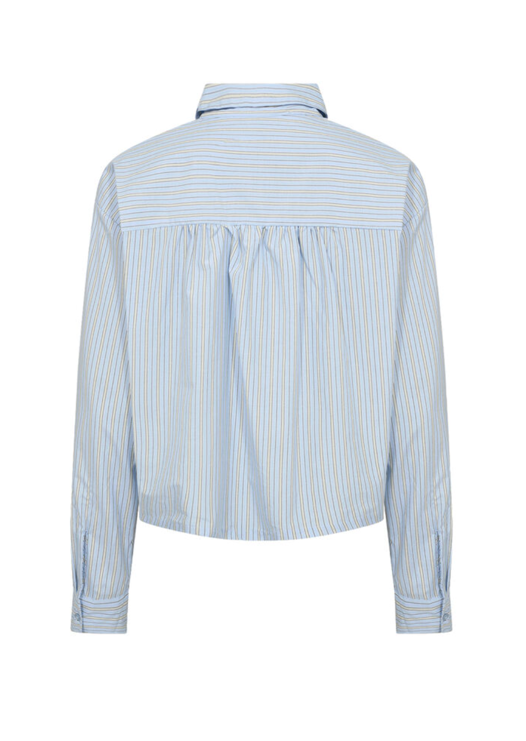 Skjorta er laget i en myk blanding av økologisk bomull og resirkulert polyester, som gir en lett og luftig følelse mot kroppen. Den har klassisk krage, knappelukking hele veien og en litt kortere lengde som gjør den ekstra fin både utenpå og lett stukket nedi buksa.