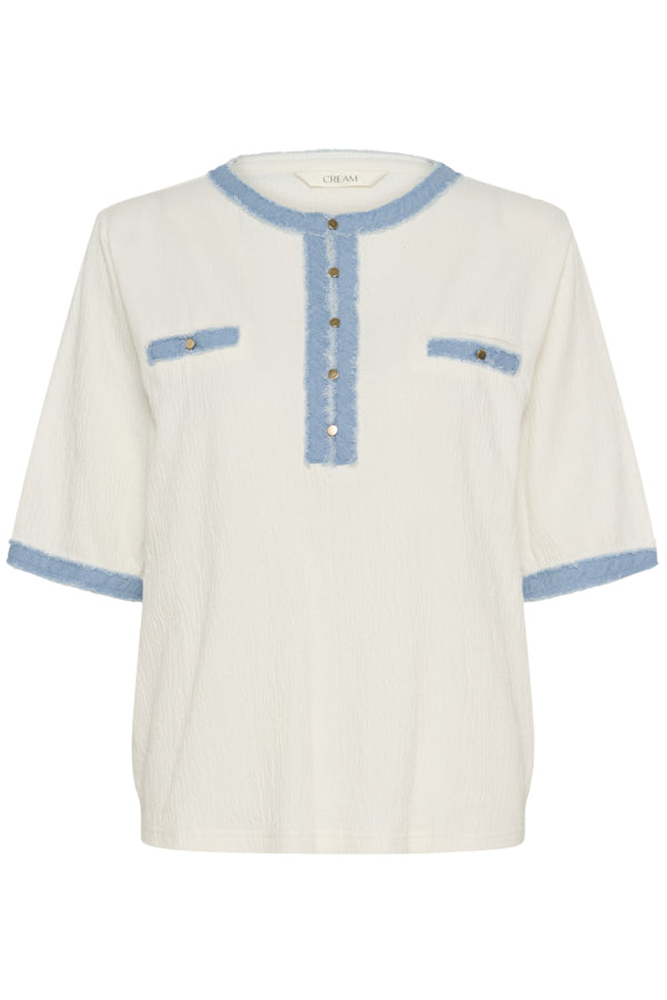 Det som gjør denne ekstra fin, er detaljene: blå kontrastkanter i halsen, langs knappestolpen, på ermene og på brystlommene. Små gullfargede knapper foran gir et klassisk og litt pyntet uttrykk – perfekt når du vil være hverdagsfin uten å føle deg overdressed.