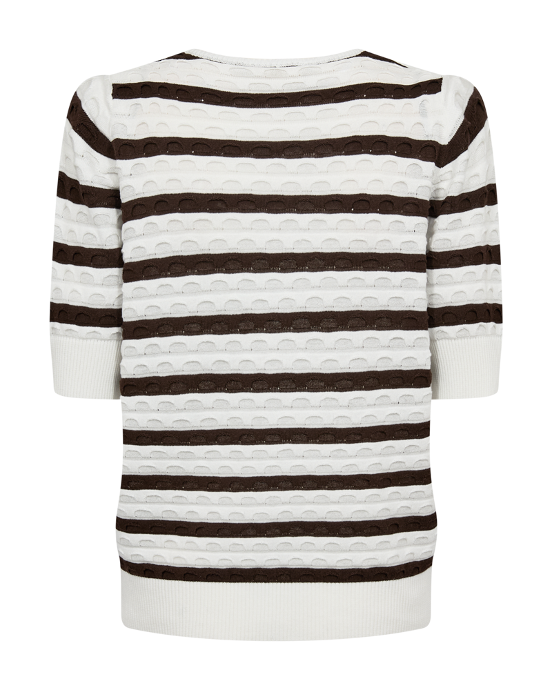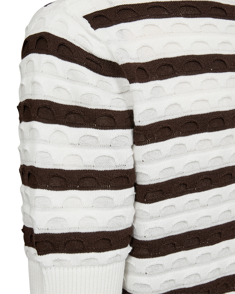 Denne strikkegenseren fra Freequent er laget i myk, finstrikket økologisk bomull med lekkert strukturmønster som gir det lille ekstra. De klassiske marineblå og offwhite stripene gjør den tidløs og lett å style – perfekt til jeans, hvit bukse eller skjørt.