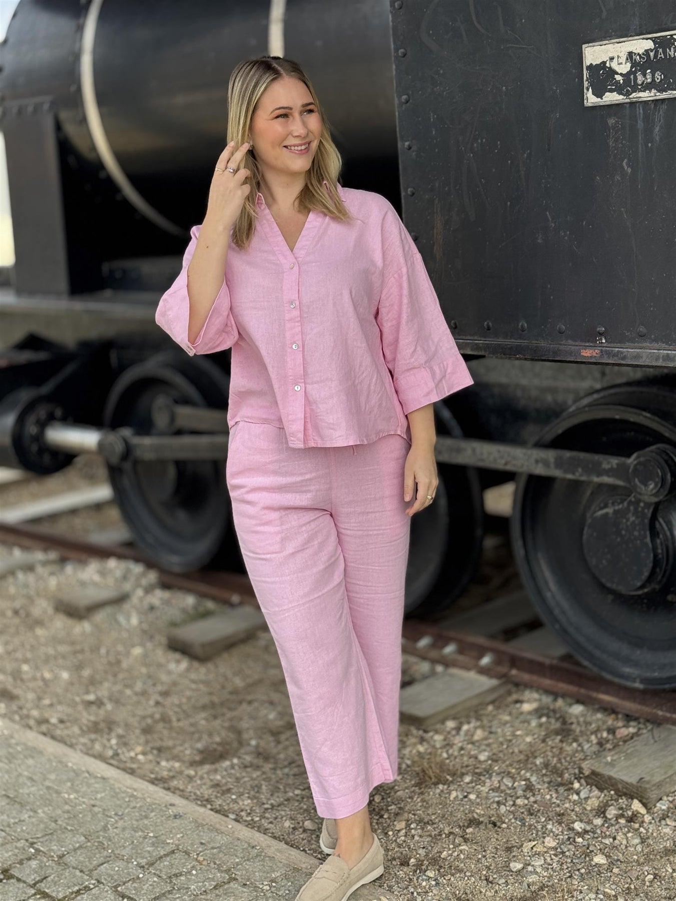 Denne blusen er en skikkelig frisk favoritt 🌸 Den fine rosafargen gir liv til antrekket, samtidig som den myke linblandingen gjør den utrolig behagelig å ha på.