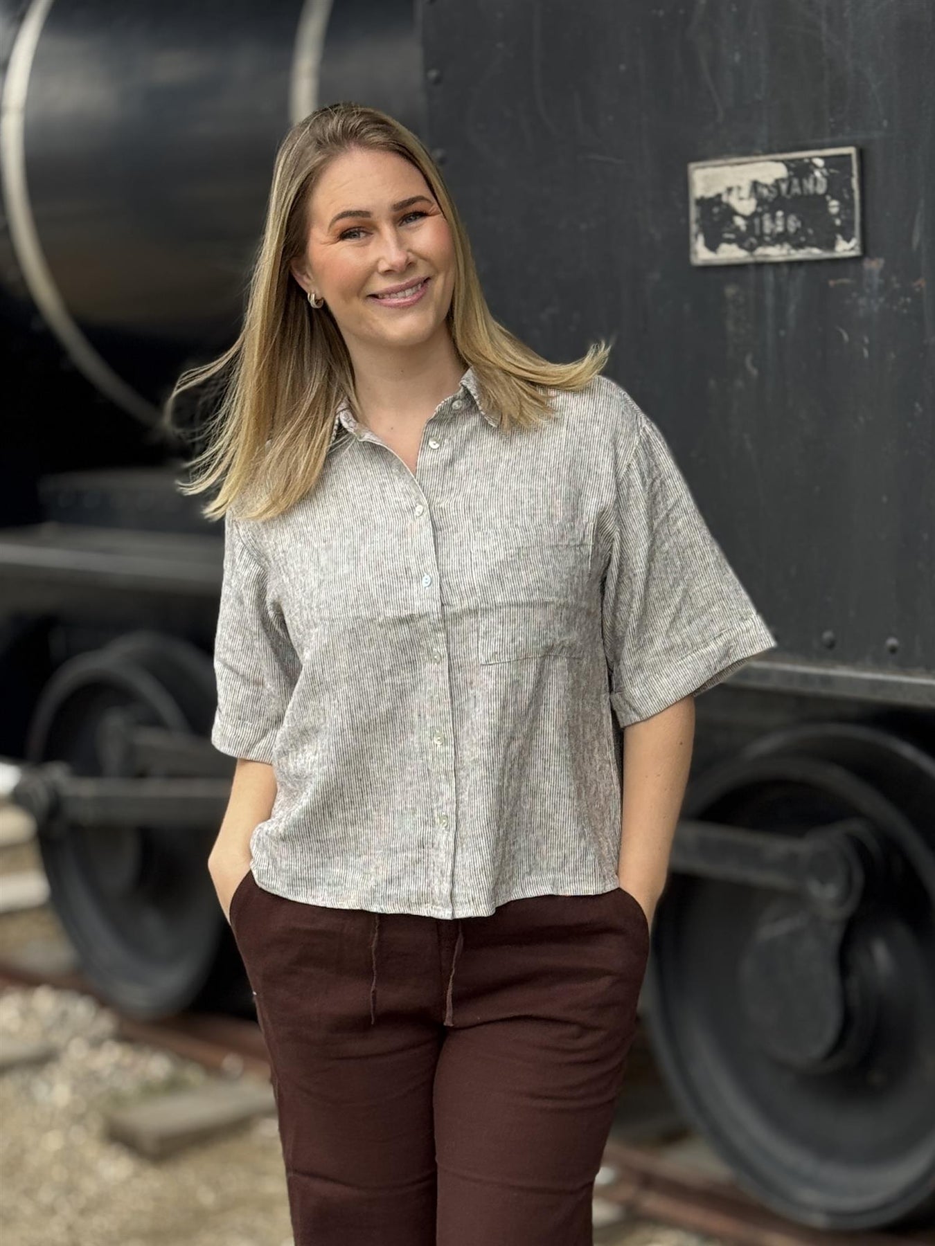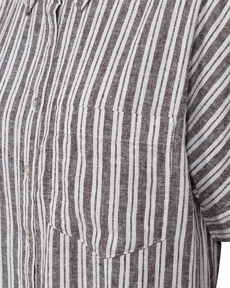 Den er laget i en myk og pustende linblanding som føles lett og behagelig mot huden. Passformen er romslig og ledig, med korte ermer som gir en luftig følelse. De klassiske stripene gir et tidløst uttrykk, mens brystlommen og knappene foran gjør den både praktisk og fin.