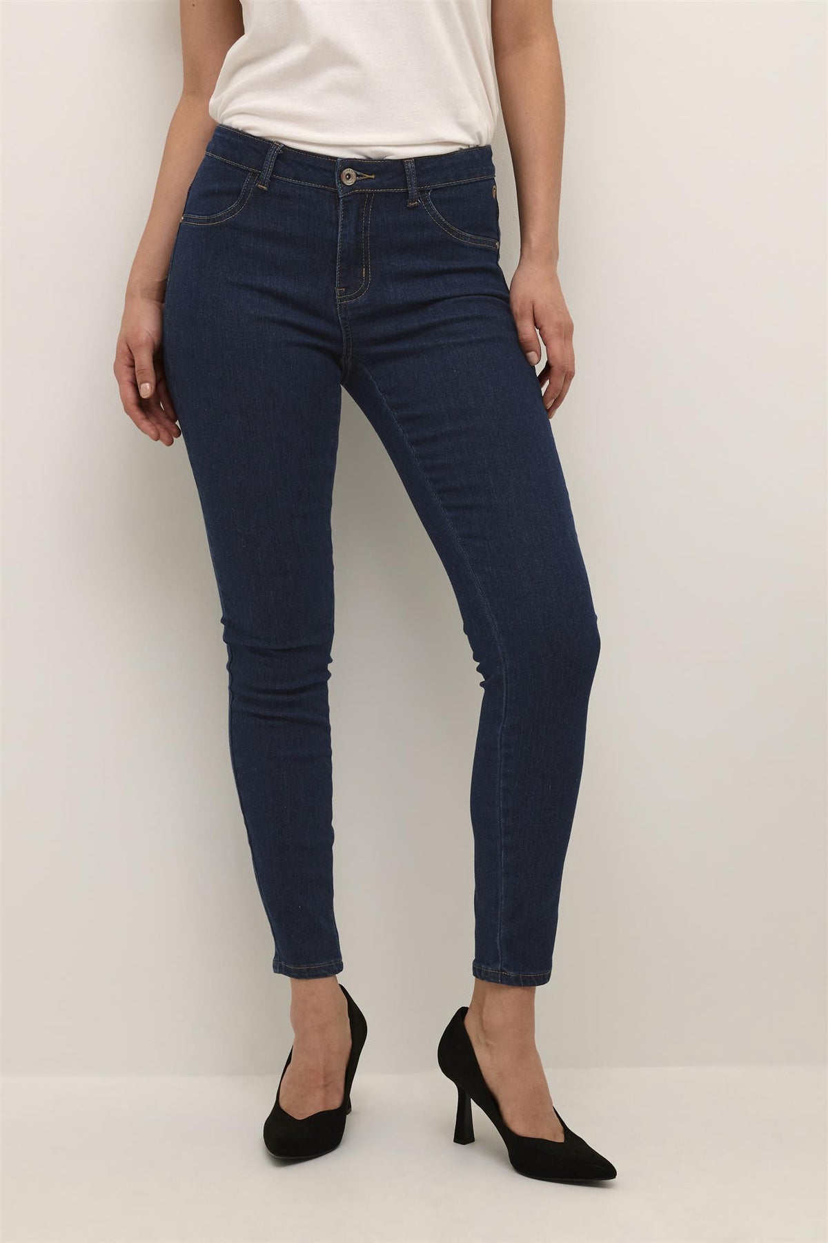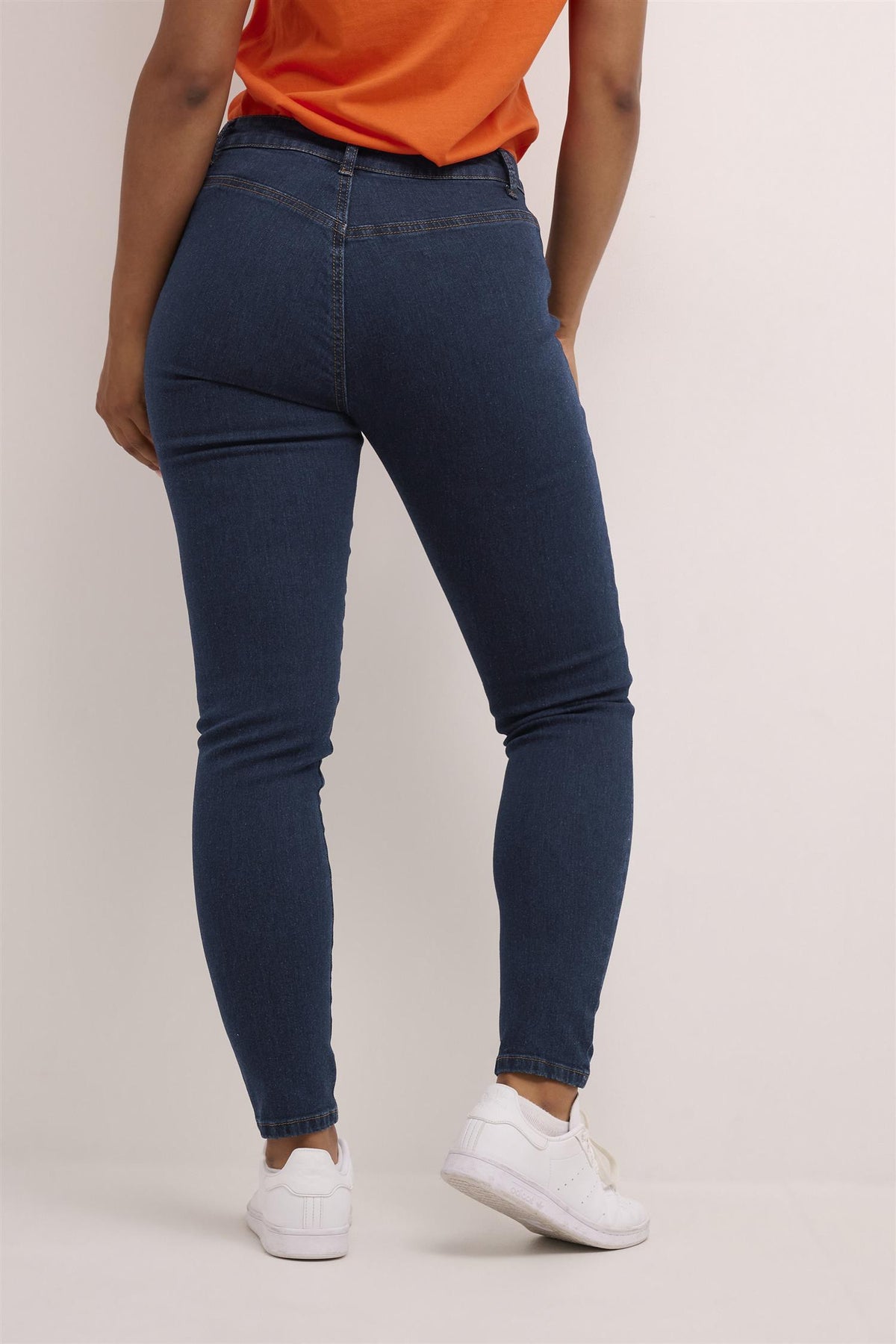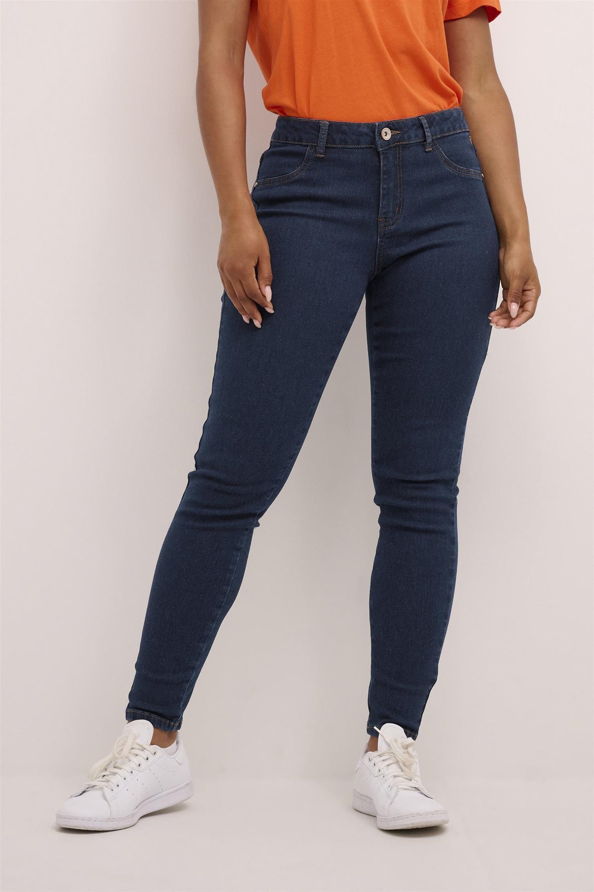 jeggings med Katy Fit - den perfekte kombinasjonen av stil og komfort. Disse buksene har et tidløs design med knappelukking og glidelås, fargen er en vakker mørk vask som passer perfekt til høst- og vinteren.