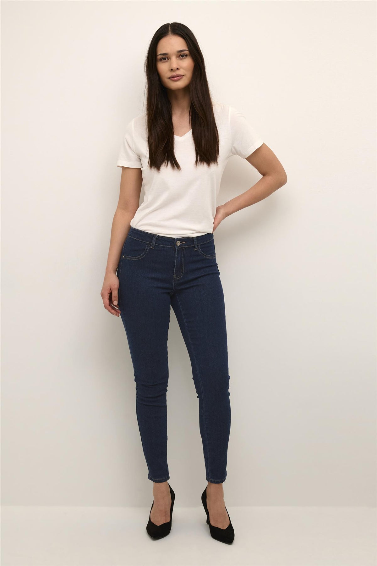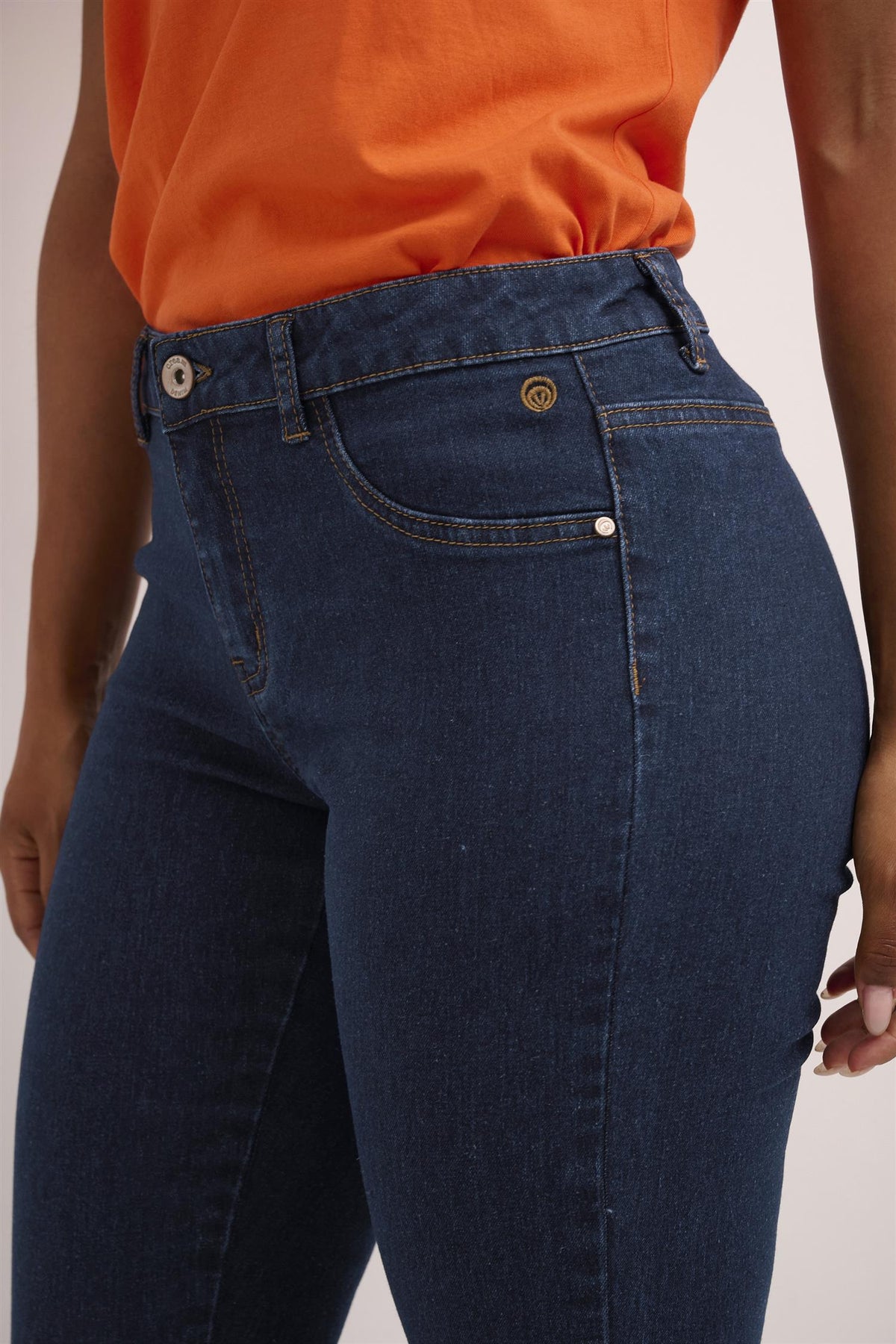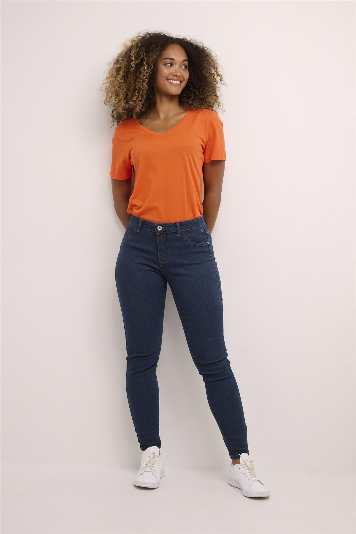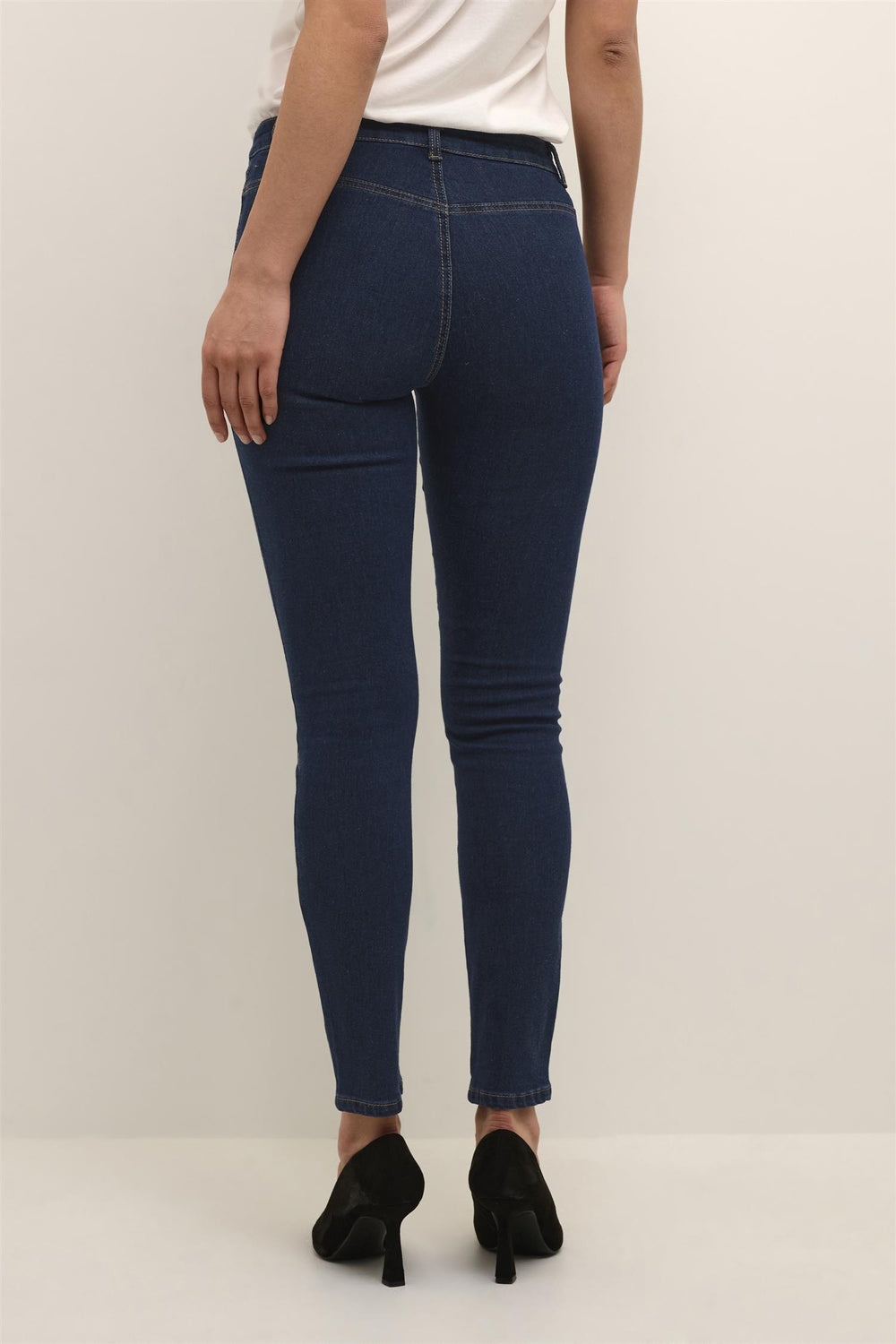 jeggings med Katy Fit - den perfekte kombinasjonen av stil og komfort. Disse buksene har et tidløs design med knappelukking og glidelås, fargen er en vakker mørk vask som passer perfekt til høst- og vinteren.