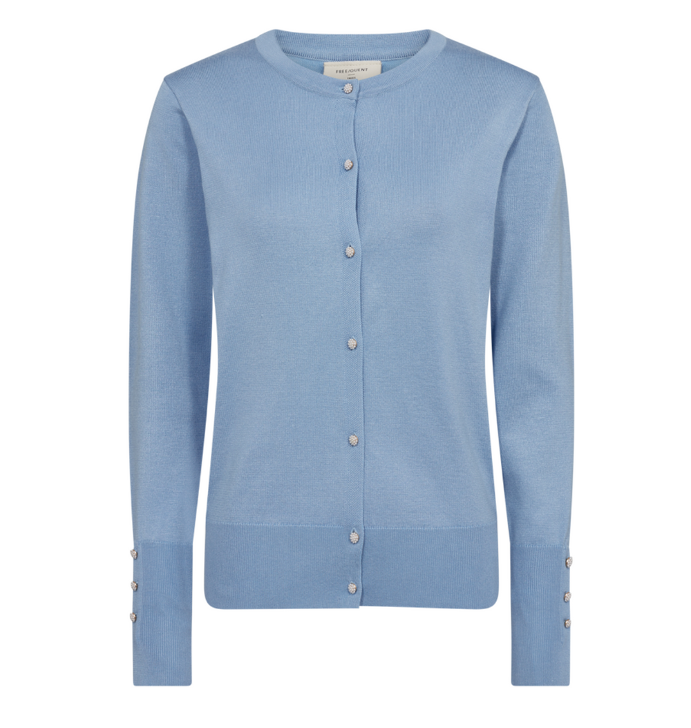 Cardigan i myk, finstrikket kvalitet. Cardiganen er enkel i sin modell med lange ermer, brede ribbekanter og de fineste knappene på ermene og knappelukking foran.