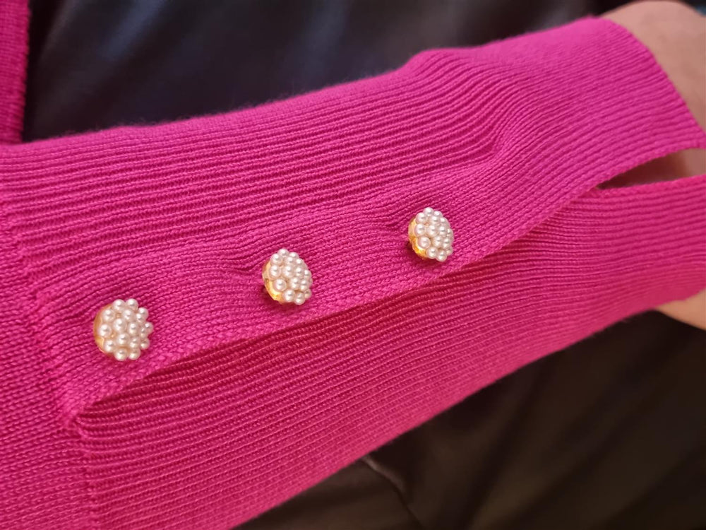 Cardigan i myk, finstrikket kvalitet. Cardiganen er enkel i sin modell med lange ermer, brede ribbekanter og de fineste knappene på ermene og knappelukking foran.